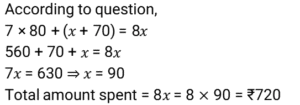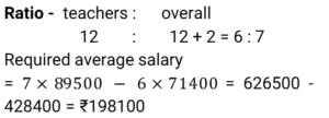 Average (SSC) (Part-2)Total Questions: 5031. A commodity is made of two metals, A and B, which cost ₹35 per kg and ₹40 per kg, respectively, in the ratio of 2 : 3. What is the cost (in ₹) of 12 kilograms of this commodity? [SSC MTS 09/10/2024 (Morning)](a) 228(b) 152(c) 456(d) 38Correct Answer: (c) 456Solution:32. In a school, the average salary of 12 teachers was ₹71,400. If the average salary of the teachers, principal and vice principal was ₹89,500, then what was the average salary of the principal and vice principal (in ₹) ? [SSC MTS 14/10/2024 (Morning)](a) 1,76,800(b) 2,11,000(c) 1,98,100(d) 1,18,900Correct Answer: (c) 1,98,100Solution:33. The average age of a class of 65 boys is 14 years. The average age of 20 of them is 14 years, and the average age of another 15 boys is 12 years. What will be the average age (in years) of the remaining boys? [SSC MTS 14/10/2024 (Evening)](a) 15(b) 14(c) 16(d) 17Correct Answer: (a) 15Solution:34. The batting average of a cricket player for 40 innings is 60 runs. His highest score in an innings exceeds his lowest score by 110 runs. If these two innings are excluded, the average score of the remaining 38 innings is 58 runs. Find his highest score. [SSC MTS 15/10/2024 (Morning)](a) 290(b) 153(c) 220(d) 310Correct Answer: (b) 153Solution:35. The average of some natural numbers is 27. If 69 is added to the first number and 12 is subtracted from the last number, the average becomes 32.7, then the number of natural numbers is: [SSC MTS 18/10/2024 (Morning)](a) 8(b) 7(c) 5(d) 10Correct Answer: (d) 10Solution:36. Eight person went to a restaurant for lunch. Seven of them spent ₹80 each on their meals, while the eighth person spent ₹70 more than the average expenditure of all eight persons. What was the total amount spent by all the individuals ? [SSC MTS 18/10/2024 (Evening)](a) ₹640(b) ₹560(c) ₹780(d) ₹720Correct Answer: (d) ₹720Solution:37. If the average of 53 consecutive even numbers is 1280. Find the difference between the smallest and the largest number. [SSC MTS 21/10/2024 (Afternoon)](a) 24(b) 34(c) 124(d) 104Correct Answer: (d) 104Solution:38. The average age of a husband and wife, and their child 3 years ago, was 27 years, and that of the wife and the child 5 years ago was 20 years. The present age of the husband is: [SSC MTS 21/10/2024 (Evening)](a) 35 years(b) 45 years(c) 50 years(d) 40 yearsCorrect Answer: (d) 40 yearsSolution:39. John has scored 60% in statistics and 70% in mathematics. A weightage of 2 is given to statistics and a weightage of 4 is given to mathematics. Which of the following expressions represents the weighted average of the two scores? [SSC MTS 22/10/202 (Afternoon)](a)(b)(c)(d)Correct Answer: (d)Solution:40. A family of seven minors and some adults has an average wheat consumption of 11.10 kg. The average consumption for minors is 5.5 kg per person, and for adults, it is 16 kg per person. Find the number of adults in the family. [SSC MTS 28/10/2024 (Morning)](a) 5(b) 6(c) 10(d) 8Correct Answer: (d) 8Solution:Submit Quiz« Previous12345Next »