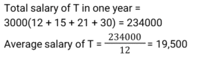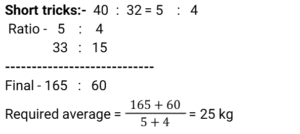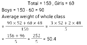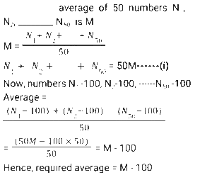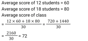 Average (SSC) (Part-3)Total Questions: 5011. A class of 30 students appeared in a test. The average score of 12 students is 60, and that of the rest is 80. What is the average score of the class? [SSC CGL 25/09/2024 (3rd Shift)](a) 73(b) 70(c) 71(d) 72Correct Answer: (d) 72Solution:12. In a class of 150 students (boys and girls only), the girls are 60. The average weight of boys is 52 kg and that of girls is 48 kg. What is the average weight (in kg) of the whole class? [SSC CGL 26/09/2024 (1st Shift)](a) 50.4(b) 48.8(c) 49.6(d) 51.2Correct Answer: (a) 50.4Solution:13. The average monthly expenditure of a family was ₹2,500 during the first 4 months, ₹2,750 during the next 5 months and ₹3,550 during the last 3 months of a year. If the total saving during the year was ₹5,500, what was the average monthly income of the family? [SSC CHSL 02/07/2024 (2nd Shift)](a) ₹5,790(b) ₹7,355(c) ₹4,375(d) ₹3,325Correct Answer: (d) ₹3,325Solution:14. In June, Rohit's bank account balance is ₹5,000 for 25 days, ₹20,000 for 2 days and ₹1,500 for 3 days. What is the average balance (in ₹) in Rohit's bank account in June? [SSC CHSL 02/07/2024 (4th Shift)](a) 5650(b) 5575(c) 6000(d) 5200Correct Answer: (a) 5650Solution:15. The salaries of T in twelve months of a year are: ₹12,000, ₹12,000, ₹12,000, ₹15,000, ₹15,000, ₹15,000, ₹21,000, ₹21,000, ₹21,000, ₹30,000, ₹30,000, ₹30,000. The average salary of T per month in ₹ is ______ . [SSC CHSL 03/07/2024 (2nd Shift)](a) 19500(b) 18500(c) 18000(d) 19000Correct Answer: (a) 19500Solution:16. If the average of 50 numbers N₁, N₂_________N₅₀ is M. Then the average of the numbers N₁-100, N₂-100,__________N₅₀-100 will be: [SSC CHSL 03/07/2024 (3rd Shift)](a) 50M(b) M-100(c) 100M(d) M-50Correct Answer: (b) M-100Solution:17. In a college, the average weight of 40 boys in a section among 72 students is 33 kg and that of the remaining students is 15 kg. What is the average weight of all the students in the section? [SSC CHSL 04/07/2024 (2nd Shift)](a) 24 kg(b) 25 kg(c) 22 kg(d) 18 kgCorrect Answer: (b) 25 kgSolution:18. If the average of a number and its reciprocal is 2, then the average of its cube and its reciprocal is equal to: [SSC CHSL 04/07/2024 (3rd Shift)](a) 36(b) 48(c) 28(d) 26Correct Answer: (d) 26Solution:19. A man bought 4 books for ₹50 each, 5 books for ₹60 each and 6 books for ₹70 each. The average cost of a book for the man is (round up to two decimal places): [SSC CHSL 04/07/2024 (4th Shift)](a) ₹61.33(b) ₹50.33(c) ₹60.33(d) ₹36.33Correct Answer: (a) ₹61.33Solution:20. Abhishek's marks in Mathematics were incorrectly entered as 93 instead of 63. Due to this, the average marks of the class in Mathematics got increased by 0.5. How many students were there in the class? [SSC CHSL 05/07/2024 (1st Shift)](a) 55(b) 60(c) 50(d) 45Correct Answer: (b) 60Solution:Submit Quiz« Previous12345Next »