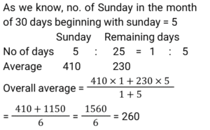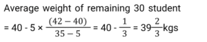 Average (SSC) (Part-3)Total Questions: 5021. The weight of the Five friends are 67 kg, 85 kg, 70 kg, 90 kg, and 103 kg. Find the average of their weights in kg. [SSC CHSL 08/07/2024 (1st Shift)](a) 90(b) 80(c) 83(d) 87Correct Answer: (c) 83Solution:22. The average weight of 35 students in a class is 40 kgs. Five of the students of this class whose average weight is 42 kgs left the class. Find the average weight of the remaining 30 students. [SSC CHSL 08/07/2024 (4th Shift)](a) 39 ⅔kgs(b) 29 ⅔kgs(c) 49 ⅔kgs(d) 19 ⅔kgsCorrect Answer: (a) 39 ⅔kgsSolution:23. The average salary of a group of 12 employees in an institution is ₹3,950 per month and that of another group of employees is ₹1,850. If the average salary of all employees is ₹2,150, then the total number of employees is: [SSC CHSL 09/07/2024 (2nd Shift)](a) 84(b) 100(c) 88(d) 72Correct Answer: (a) 84Solution:24. A public library has an average attendance of 410 on Sundays and 230 for the remaining days. The average attendance per day of a month of 30 days beginning with Sunday would be: [SSC CHSL 10/07/2024 (3rd Shift)](a) 230(b) 254(c) 260(d) 320Correct Answer: (c) 260Solution:25. In two successive years, 75 and 50 employees of a company appeared at the departmental examination. Respectively, 84% and 52% of them passed. The average rate of pass percentage is: [SSC CHSL 11/07/2024 (3rd Shift)](a) 71%(b) 41%(c) 71 ⅕%(d) 41 ⅕%Correct Answer: (c) 71 ⅕%Solution:26. The average of 50 numbers is 23. If each number is multiplied by 13, then the new average is : [SSC CHSL 11/07/2024 (4th Shift)](a) 88(b) 299(c) 650(d) 219Correct Answer: (b) 299Solution:27. Three boys, on an average, are 25 years old, and their age are in the ratio of 3 : 5 : 7. What is the age of youngest boy? [SSC CPO 27/06/2024 (2nd Shift)](a) 12 years(b) 15 years(c) 21 years(d) 24 yearsCorrect Answer: (b) 15 yearsSolution:28. Anwesha's marks in a class text of Sanskrit were incorrectly entered as 99 instead of 66. If there are 55 students in the class, then what is the increment in the average marks of the class in Sanskrit because of this typing error? [SSC CPO 28/06/2024 (1st Shift)](a) 0.2(b) 0.8(c) 0.4(d) 0.6Correct Answer: (d) 0.6Solution:29. In a class, there are 60 students. The average weight of the entire class is 42 kg. If there are 36 boys in the class and the average weight of all the boys is 50 kg, then what is the average weight (in kg) of all the girls? [SSC CPO 28/06/2024 (2nd Shift)](a) 30(b) 32(c) 36(d) 34Correct Answer: (a) 30Solution:30. Find the average of 642, 253, 834 and 303. [Matriculation Level 20/06/2024 (Shift-1)](a) 508(b) 509(c) 512(d) 452Correct Answer: (a) 508Solution:Submit Quiz« Previous12345Next »