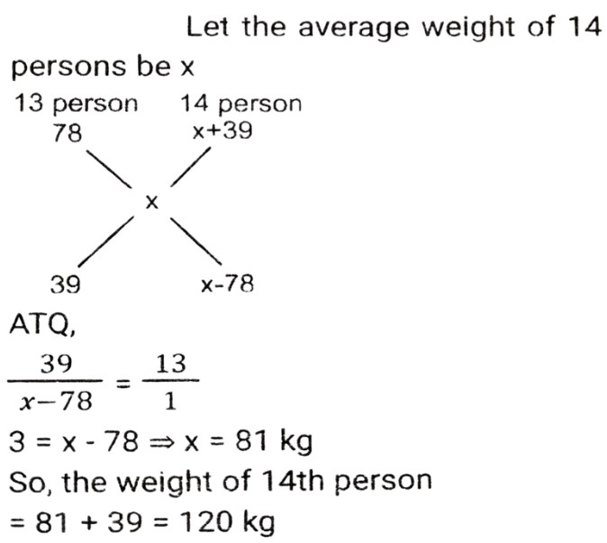 5. The average weight of the first thirteen persons among fourteen persons is 78 kg. The weight of the 14th person is 39 kg more than the average weight of all the fourteen persons. Find the weight of the 14th person. [SSC CGL Tier II (26/10/2023)]