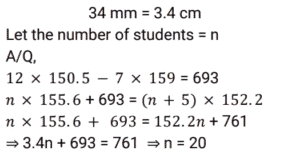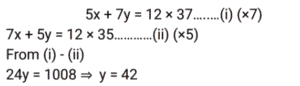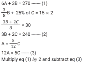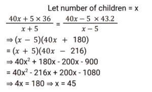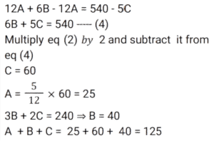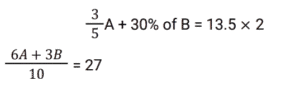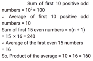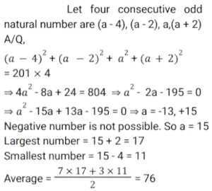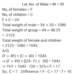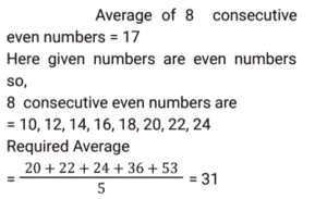 Average (SSC) (Part-7)Total Questions: 2711. The average of 8 consecutive even numbers written in ascending order is 17. What is the average of the last three numbers, 36 and 53? [SSC CGL 17/8/2021 (Morning)](a) 32.2(b) 29.8(c) 31.6(d) 31Correct Answer: (d) 31Solution:12. The average of x occurring 5 times and y occurring 7 times is 37. Also, the average of x occurring 7 times and y occurring 5 times is 35. The value of y is: [SSC CGL 18/08/2021 (Morning)](a) 30(b) 27(c) 42(d) 45Correct Answer: (c) 42Solution:13. The average daily production of toys in a factory in the month of December is 512. If the average production during the first 20 days is 515 and that of the last 13 days is 510, then what is the average of production on 19 and 20 December? [SSC CGL 18/08/2021 (Evening)](a) 1058(b) 529(c) 513(d) 512Correct Answer: (b) 529Solution:14. The average weight of a certain number of students in a class is 55.5 kg. If 4 students with average weight 60 kg join the class, then the average weight of all students in the class increases by 360 gm. The number of students in the class, initially, is: [SSC CGL 20/8/2021 (Evening)](a) 41(b) 31(c) 36(d) 46Correct Answer: (d) 46Solution: 15. There are some children in a camp and their average weight is 40 kg. If 5 children with average weight 36 kg join the camp or if 5 children with average weight 43.2 kg leave the camp, the average weight of children in both cases is equal. How many children are there in the camp, initially? [SSC CGL 23/8/2021 (Evening)](a) 35(b) 45(c) 40(d) 50Correct Answer: (b) 45Solution:16. What is the product of the average of first ten positive odd numbers and the average of first fifteen positive even numbers? [SSC CGL 24/8/2021 (Afternoon)](a) 85.25(b) 44(c) 160(d) 150Correct Answer: (c) 160Solution:17. The average height of a certain number of students in a group is 155.6 cm. If 12 students having an average height of 150.5 cm join the group and 7 students having an average height of 159 cm leave the group, the average height of the students in the group will decrease by 34 mm. What is the number of students, initially, in the group? [SSC CHSL 5/8/2021 (Morning)](a) 30(b) 25(c) 40(d) 20Correct Answer: (d) 20Solution:18. The average of the squares of four consecutive odd natural numbers is 201. The average of 7 times of the largest number and 3 times of the smallest number is: [SSC CHSL 6/8/2021 (Evening)](a) 72(b) 78(c) 76(d) 66Correct Answer: (c) 76Solution:19. There are 3 groups of personnel, male, female and children. There are 20 males and the number of females and children taken together is 4 more than that of the males. The average weight of the males is 54 kg, that of females is 49 kg and that of children is 30 kg. If the average weight of the whole group is 48.25 kg, then what is the difference between the number of females and the number of children? [SSC CHSL 10/8/2021 (Morning)](a) 17(b) 10(c) 7(d) 14Correct Answer: (b) 10Solution:20. A, B and C are three positive numbers such that the average of three-fifth of A and 30% of B is 13.5 and the average of ⅜ times of B and 25% of C is 15. A is equal to ⁵⁄₁₂ times of C, then the sum of all three numbers A, B and C is: [SSC CHSL 11/8/2021 (Afternoon)](a) 125(b) 135(c) 145(d) 120Correct Answer: (a) 125Solution: Submit Quiz« Previous123Next »