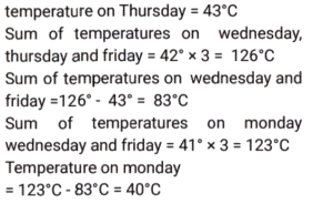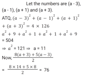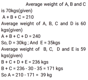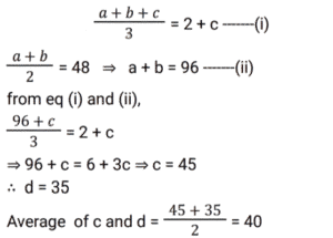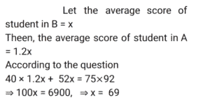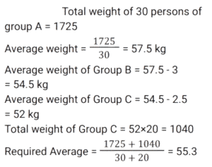 Average (SSC) (Part-7)Total Questions: 2721. The average age of 7 members of a family is 35 years. If the youngest members are twins and they are 15 years old, then what was the average age (in years) of the family members at the time of the birth of the twins? [SSC CHSL 12/8/2021 (Afternoon)](a) 28(b) 27(c) 30(d) 25Correct Answer: (a) 28Solution:22. The average weight of 30 persons of group A is 3 kg more than the average weight of 25 persons of group B. The average weight of 25 persons of group B is 2.5 kg more than the average weight of 20 persons of group C. If the total weight of 30 persons of group A is 1725 kg, then what will be the average weight of the persons of group A and group C taken together? [SSC CHSL 12/04/2021 (Morning)](a) 55.3(b) 55.4(c) 55.1(d) 55Correct Answer: (a) 55.3Solution:23. The average of the squares of four consecutive even natural numbers is 126. The average of 8 times of the greatest number and 5 times of the smallest number is: [SSC CHSL 15/4/2021 (Evening)](a) 66(b) 76(c) 68(d) 74Correct Answer: (b) 76Solution:24. The average weight of a group of 3 people A, B and C is 70 kg. When D joins this group, the average becomes 60 kg. One man E whose weight is 5 kg more than that of D, replaces A and the average weight of B, C, D and E now becomes 59 kg. A’s weight (in kg) is: [SSC CPO 23/11/2020 (Evening)](a) 50(b) 40(c) 39(d) 59Correct Answer: (c) 39Solution:25. The average temperature for monday, wednesday and friday was 41°C. The average for wednesday, thursday and friday was 42°C, If the temperature on Thursday was 43°C, then the temperature on monday was: [SSC CPO 24/11/2020 (Evening)](a) 42°C(b) 40°C(c) 43°C(d) 41°CCorrect Answer: (b) 40°CSolution:26. The average of three numbers a, b and c is 2 more than c. The average of a and b is 48. If d is 10 less than c then the average of c and d is: [SSC CGL Tier II (15/11/2020)](a) 36(b) 40(c) 35(d) 38Correct Answer: (b) 40Solution:27. The number of students in section A and section B of the class are 40 and 52, respectively. The average score in mathematics of all the students is 75. If the average score of the students in A is 20% more than that of students in B, then what is the average score of students in B? [SSC CGL Tier II (16/11/2020)](a) 65(b) 63(c) 71(d) 69Correct Answer: (d) 69Solution:Submit Quiz« Previous123