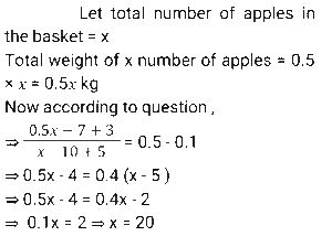 3. The average weight of a certain number of apples in a basket was 0.5 kg. If 10 apples with an average weight of 0.7 kg are removed from the basket and 5 apples with an average weight of 0.6 kg are added to the basket, then the average weight of the apples in the basket decreases by 0.1 kg. What was the initial number of apples in the basket? [SSC MTS 15/10/2024 (Afternoon)]