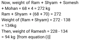 4. The average weight of three friends Ram, Ramesh and Shyam is 76 kg. Somesh joins them and the average weight of the four friends becomes 74 kg. If Mohan, whose weight is 2 kg more than that of Somesh replaces Ramesh, the average weight of Ram, Shyam, Somesh and Mohan becomes 68 kg. Find the weight of Ramesh. [SSC MTS 08/10/2024 (Afternoon)]