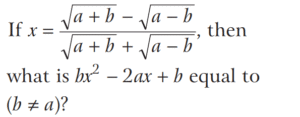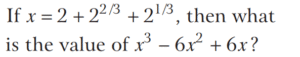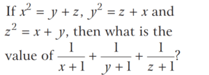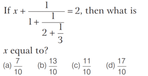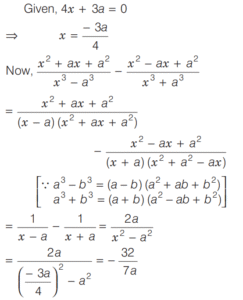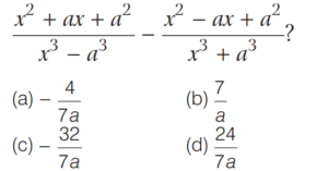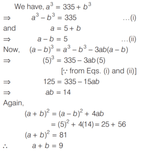 BASIC OPERATION AND FACTORISATION (CDS)Total Questions: 7741. If the HCF of polynomials f(x) = (x - l)(x² + 3x + a) and g(x) = (x + 2)(x² + 2x + b) is (x² + x - 2) then what are the values of a and b respectively? [2017 (II) Evening Shift](a) 2, 2(b) 2, -3(c) -1, -3(d) -2, -1Correct Answer: (b) 2, -3Solution:42. Solve the following equation [2017 (I) Morning Shift ](a) 0(b) 1(c) ab(d) 2abCorrect Answer: (a) 0Solution: 43. Solve the following equation [2017 (I) Morning Shift ](a) 0(b) 1(c) 2(d) 3Correct Answer: (c) 2Solution:44. If a³ = 335 + b³ and a = 5 + b, then what is the value of a + b (given that a > 0 and b > 0 ) ? [2017 (I) Morning Shift ](a) 7(b) 9(c) 16(d) 49Correct Answer: (b) 9Solution:45. If a + b = 5 and ab = 6 then what is the value of a³ + b³ ? [2017 (I) Morning Shift ](a) 35(b) 40(c) 90(d) 125Correct Answer: (a) 35Solution:We know that,46. (x + 4) is a factor of which one of the following expressions? [2017 (I) Morning Shift ](a) x² - 7x + 44(b) x² + 7x - 44(c) x² - 7x - 44(d) x² + 7x + 44Correct Answer: (c) x² - 7x - 44Solution:We have, (x + 4) as a factor47. Solve the following equation [2017 (I) Morning Shift ](a) 3(b) 2(c) 1(d) 0Correct Answer: (b) 2Solution:We have,48. Solve the following equation [2016 (II) Evening Shift](a) − 1(b) 1(c) 2(d) 4Correct Answer: (b) 1Solution:Given, 49. Solve the following equation [2016 (II) Evening Shift](a)(b)(c)(d)Correct Answer: (b)Solution:50. If 4x + 3a = 0, then what is the value of [2016 (II) Evening Shift](a)(b)(c)(d)Correct Answer: (c)Solution:Submit Quiz« Previous12345678Next »