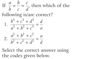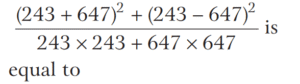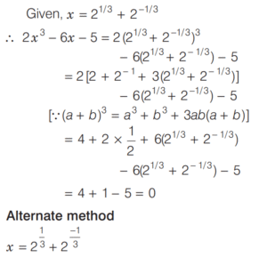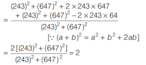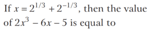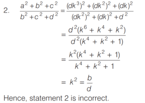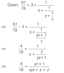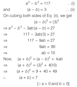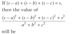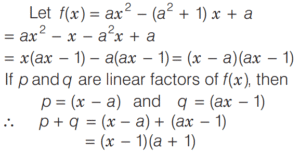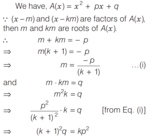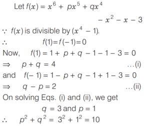 BASIC OPERATION AND FACTORISATION (CDS)Total Questions: 7751. For what value of k is (x + 1) a factor of x³ + kx² - x + 2 ? [2016 (I) Morning Shift](a) 4(b) 3(c) 1(d) -2Correct Answer: (d) -2Solution:52. Solve the following equation [2016 (I) Morning Shift](a) 1(b) 2(c) 3(d) 4Correct Answer: (c) 3Solution: 53. If (s - a) + (s - b) + (s - c) = s then the value of [2016 (I) Morning Shift](a) 3(b) 1(c) 0(d) -1Correct Answer: (b) 1Solution:Given, (s - a) + (s - b) + (s - c) = s, ⇒ 2s = (a + b + c)54. Let p and q be non-zero integers. Consider the polynomial A(x) = x² + px + q It is given that (x - m) and (x - km) are simple factors of A (x), where m is a non-zero integer and k is a positive integer, k ≥ 2 Which one of the following is correct? [2016 (I) Morning Shift](a) (k + 1)²p² = kq(b) (k + 1)²q = kp²(c) k²q = (k + 1)p²(d) k²p² = (k + 1)²qCorrect Answer: (b) (k + 1)²q = kp²Solution:55. If the linear factors of ax² - (a² + 1) x + a are p and q, then p + q is equal to [2016 (I) Morning Shift](a) (x - 1)(a + 1)(b) (x + 1)(a + 1)(c) (x - 1)(a - 1)(d) (x + 1)(a - 1)Correct Answer: (a) (x - 1)(a + 1)Solution:56. The value of the expression [2016 (I) Morning Shift](a) 0(b) 1(c) 2(d) 3Correct Answer: (c) 2Solution: 57. If the polynomial x⁶ + px⁵ + qx⁴ - x² - x - 3 is divisible by (x⁴ - 1) then the value of p² + q² is [2016 (I) Morning Shift](a) 1(b) 9(c) 10(d) 13Correct Answer: (c) 10Solution:58. Solve the following equation [2016 (I) Morning Shift](a) Only 1(b) Only 2(c) Both 1 and 2(d) Neither 1 nor 2Correct Answer: (a) Only 1Solution: 59. Solve the following equation [2016 (I) Morning Shift](a) 0(b) 1(c) 2(d) 3Correct Answer: (a) 0Solution: 60. If a³ = 117 + b³ and a = 3 + b then the value of a + b is (given that a > 0 and b > 0 ) [2016 (I) Morning Shift](a) 7(b) 9(c) 11(d) 13Correct Answer: (a) 7Solution:We have,Submit Quiz« Previous12345678Next »