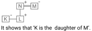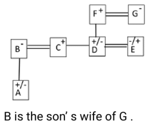 Blood Relation – Railway Reasoning part – 4Total Questions: 521. B is A’s mother. C is D’s brother. There are three married couples - B and C; D and E; F and G. [RRB NTPC 24/07/2021 (Morning)]F is the father- in - law of E. How is B related to G ?(a) Mother(b) Son’s daughter(c) Daughter(d) Son’s wifeCorrect Answer: (d) Son’s wifeSolution:2. If P and Q are sisters, R is Q’s father, S is R’s mother, and T is S’s brother, then how is P related to S? [RRB NTPC 24/07/2021 (Evening)](a) Mother’s mother(b) Son’s daughter(c) Father’s sister(d) Mother’s sisterCorrect Answer: (b) Son’s daughterSolution:From the given information we can draw the following flow chart for the blood relation :From the above figure, we can see that P is the son’s daughter of S .3. If ‘P + Q’ means ‘P is the brother of Q’, ‘P-Q’ means ‘P is the sister of Q’, ‘P*Q’ means ‘P is the husband of Q’, and ‘P/Q’ means ‘P is the son of Q’, then which of the following shows that ‘K is the daughter of M’? [RRB NTPC 26/07/2021 (Morning)](a) K - L / N * M(b) K + L / N - M(c) K - L / N + M(d) L * K - N + MCorrect Answer: (a) K - L / N * MSolution:According to option (a)4. If ‘U - V ÷ W + Y × Z’, then how is Z related to V? [RRB NTPC 26/07/2021 (Evening)]’A ÷ B’ means ‘A is the daughter of B’. ‘A x B’ means ‘A is the husband of B’. ‘A - B’ means ‘A is the mother of B’. ‘A + B’ means ‘A is the brother of B’.(a) Mother’s sister(b) Mother’s brother’s wife(c) Daughter(d) Father’s brother’s wifeCorrect Answer: (d) Father’s brother’s wifeSolution:‘U - V ÷ W + Y × ZFrom the above figure it is clear that Z is the Father’s brother’s wife of V.5. Aman and Barun are brothers. Eva is the daughter of Diva. Diva is the sister of Fiza’s husband, Barun.How is Eva related to Aman? [RRB NTPC 31/07/2021 (Morning)](a) Daughter(b) Brother’s daughter(c) Brother’s wife’s sister(d) Sister’s daughterCorrect Answer: (d) Sister’s daughterSolution:From the above figure it is clear that Eva is the Sister’s daughter of Aman.6. M is Y’s daughter and X is N’s mother. P is A’s father and B is N’s son. M does not have any sister. P is married to M, and X is married to Y. How is B related to P? [RRB NTPC 31/07/2021 (Morning)](a) Wife’s brother(b) Brother’s son(c) Wife’s brother’s son(d) Father’s brotherCorrect Answer: (c) Wife’s brother’s sonSolution:From the above figure it is clear that B is the Wife’s brother’s Son of P.7. Sural is the only son of X’s mother-in-law’s husband Veer. Kashish is the wife of Sural. Sural has only one sister named Wimra. How is X related to Wimra ? [RRB NTPC 31/07/2021 (Evening)](a) Paternal Uncle(b) Husband(c) Wife(d) Maternal UncleCorrect Answer: (b) HusbandSolution:From the above figure it is clear that X is husband of Wimra.8. Two Men, Emmet and Ferdinand, were best friends until the daughter of Emmet’s maternal aunt’s only sibling got married to the only child of Ferdinand’s father. How is Emmet related to Ferdinand now? [RRB NTPC 31/07/2021 (Evening)](a) Maternal Uncle(b) Wife’s father(d) Wife’s brother(d) Wife’s brotherCorrect Answer: (d) Wife’s brotherSolution:From the above figure it is clear that Emmet is Wife’s brother of Ferdinand.9. If C % D means C is the mother of D, C $ D means C is the wife of D, and if C & D means C is the son-in-law of D, then what will be the meaning of ‘W % X $ Y & Z?’ [ALP Tier II 21/01/2019 (Morning)](a) Z is the wife of W(b) Z is the daughter of W(c) W is the daughter of Z's son(d) Z is the husband of WCorrect Answer: (d) Z is the husband of WSolution:We can clearly see that Z is the husband of W.10. If A $ B means A is the sister of B, A # B means A is the mother of B and A × B means A is the father of B, then ‘P x Q $ R # S’ What does S stand for? [ALP Tier II 21/01/2019 (Afternoon)](a) P is the son-in-law of S(b) P is maternal grandfather of S(c) P is the father of S(d) P is the son of SCorrect Answer: (b) P is maternal grandfather of SSolution:We can clearly see that P is the father of R and R is the mother of S. So, P is the maternal grandfather of S.Submit Quiz123456Next »