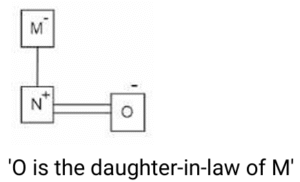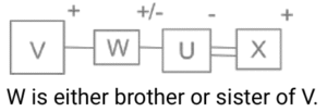 Blood Relation – Railway Reasoning part – 4Total Questions: 5231. Read the following statements and answer the question based on them [RPF S.I. 10/01/2019 (Afternoon)]A@B means A is the mother of B. A#B means A is the father of B. A$B means A is the wife of B. A%B means A is the husband of B. Which of the following shows that 'O is the daughter-in-law of M'?(a) M%N@O(b) M#N@O(c) M@N%O(d) M@N$OCorrect Answer: (c) M@N%OSolution:32. Pointing to a photograph of a boy, a man said to his wife, "He is the only brother of daughter of paternal grandfather of your son." Who is the boy in the photograph ? [RPF S.I. 10/01/2019 (Afternoon)](a) Man himself(b) Man's son(c) Man's brother(d) Man's fatherCorrect Answer: (a) Man himselfSolution:The boy in photograph is the man himself.33. Looking at the portrait of a girl, Shesha, a girl, said, “Her mother is my maternal grandfather's only daughter who has only one daughter and no sons". How is Shesha related to the girl in the portrait? [RRB ALP 09/08/2018 (Morning)](a) Shesha is the girl in the portrait(b) Niece(c) Sister(d) AuntCorrect Answer: (a) Shesha is the girl in the portraitSolution:34. If V is the brother of U, U is the sister of W and X is the husband of U, then U is V's ________ [RRB ALP 10/08/2018 (Afternoon)](a) Mother(b) Aunt(c) Sister(d) Sister-in-lawCorrect Answer: (c) SisterSolution:35. Ryaan is Vehaan's mother's sister's father's only son's son. How is Ryaan related to Vehaan ? [RRB ALP 10/08/2018 (Evening)](a) Son(b) Nephew(c) Cousin(d) UncleCorrect Answer: (c) CousinSolution:Ryaan is cousin of Vehaan.36. If X has two sisters -Yand Z, and W's mother is the sister of Y's father, then W is Z’s _____. [RRB ALP 10/08/2018 (Evening)](a) Mother(b) Cousin(c) Niece(d) FatherCorrect Answer: (b) CousinSolution:37. A man looks at a portrait and says, "She is my Father-in-law's only grand-daughter". How is the girl in the portrait related to this man's wife ? [RRB ALP 13/08/2018 (Afternoon)](a) Daughter(b) Sister(c) Niece(d) MotherCorrect Answer: (a) DaughterSolution:The girl in portrait is the daughter of the wife of the man.38. Pointing at X, Y says, "X is the son of the only son of my mother". Then Y is X's._________. [RRB ALP 17/08/2018 (Morning)](a) Brother(b) Father-in-law(c) Father(d) GrandfatherCorrect Answer: (c) FatherSolution:Y is X’s father.39. P is S's mother's only son's wife. How is P related to S? [RRB ALP 17/08/2018 (Afternoon)](a) Mother-in-law(b) Sister-in-law(c) Sister(d) Daughter-in-lawCorrect Answer: (b) Sister-in-lawSolution:From the figure we can tell that S is P’s sister in law.40. If V is the brother of U, U is the sister of W and X is the husband of U, then W is V's ? [RRB ALP 17/08/2018 (Evening)](a) Uncle or aunty(b) Brother-in-law or sister-in-law(c) Brother or sister(d) MotherCorrect Answer: (c) Brother or sisterSolution:Submit Quiz« Previous123456Next »