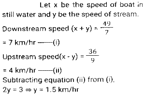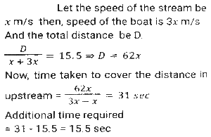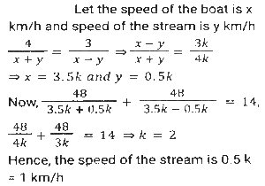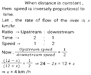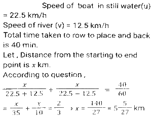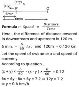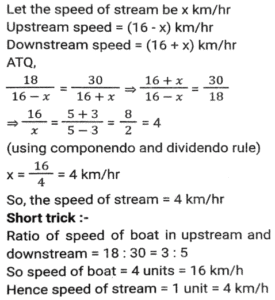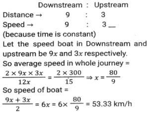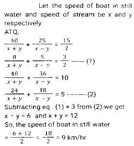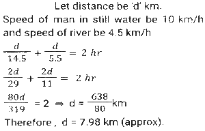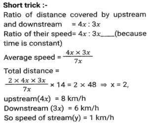 Boat and Stream (Part-2)Total Questions: 2711. Ankit went to Manali, for river rafting. He rows at the rate of 12 km/h in still water. To cover the same distance, it takes him twice as long to row up as to row down the river. Find the rate of flow of the river. [SSC CHSL 15/03/2023 (3rd Shift)](a) 6 km/h(b) 4 km/h(c) 8 km/h(d) 2 km/hCorrect Answer: (b) 4 km/hSolution:12. A man can row 10 km/h in still water. When the river is running at a speed of 4.5 km/h, then it takes him 2 h to row to a place and comes back to the initial point. How far is the place (in km) (rounded off to two decimal places)? [SSC CGL Tier II (02/03/2023)](a) 5.50(b) 8.98(c) 7.98(d) 6.25Correct Answer: (c) 7.98Solution:13. A swimmer swims from a point P against the current for 6 min and then swims back along the current for next 6 min and reaches at a point Q. If the distance between P and Q is 120 m then the speed of the current (in km/h) is: [SSC CGL 01/12/2022 (3rd Shift)](a) 0.4(b) 0.2(c) 1(d) 0.6Correct Answer: (d) 0.6Solution:14. A boat racer can row 21³⁄₂ still water. If the speed of river is 12.5 km/h, it takes him 40 minutes to row to a place and back, how far off is the place ? [SSC CGL 06/12/2022 (1st Shift)](a) 5⁵⁄₂₇ km(b) 5⅖ km(c) 4⁵⁄₂₇ km(d) 3⁵⁄₂₇ kmCorrect Answer: (a) 5⁵⁄₂₇ kmSolution:15. A man rows to a place 48 km distant and comes back in 14 hours. He finds that he can row 4 km with the stream in the same time as 3 km against the stream. The speed of the stream is: [SSC CGL 07/12/2022 (2nd Shift)](a) 1.5 km/h(b) 3.5 km/h(c) 1.8 km/h(d) 1 km/hCorrect Answer: (d) 1 km/hSolution:16. A boat can go 40 km downstream and 25 km upstream in 7 hours 30 minutes. It can go 48 km downstream and 36 km upstream in 10 hours. What is the speed (in km/h) of the boat in still water? [SSC CPO 09/11/2022 (Evening)](a) 6(b) 12(c) 9(d) 15Correct Answer: (c) 9Solution:17. The speed of a boat in still water is thrice the speed of the stream. If the boat takes 15.5 sec to go to a certain place downstream, then find the additional time required to cover the same distance traveling upstream. [SSC CPO 11/11/2022 (Afternoon)](a) 15.5 sec(b) 29 sec(c) 31 sec(d) 35 secCorrect Answer: (a) 15.5 secSolution:18. A person can row downstream 49 km in 7 hours and upstream 36 km in 9 hours. What is the speed of the current? [Higher Secondary 02/08/2022 (Shift-2)](a) 1.5 km/h(b) 2 km/h(c) 2.5 km/h(d) 3 km/hCorrect Answer: (a) 1.5 km/hSolution:19. The speed of a boat in still water is 16 km/h. The time taken by the boat to cover a distance of 18 km upstream is equal to the time taken by the boat to travel 30 km downstream. What is the speed of the stream?(in km/h) [SSC MTS 06/07/2022 (Evening)](a) 4(b) 7(c) 5(d) 6Correct Answer: (a) 4Solution:20. A man rows from J and K (upstream) and back from K and J (downstream) in a total time of 15 hours. The distance between J and K is 300 km. The time taken by the man to row 9 km downstream is identical to the time taken by him to row 3 km upstream. What is the approximate speed of the boat in still water?(in km/h) [SSC MTS 12/07/2022 (Evening)](a) 51.33(b) 47.67(c) 53.33(d) 43.67Correct Answer: (c) 53.33Solution:Submit Quiz« Previous123Next »