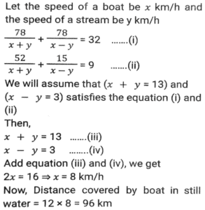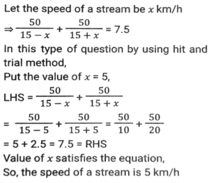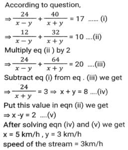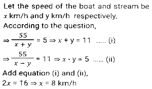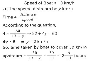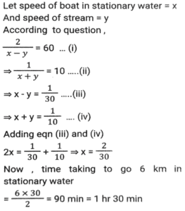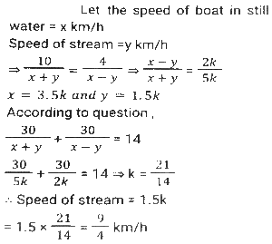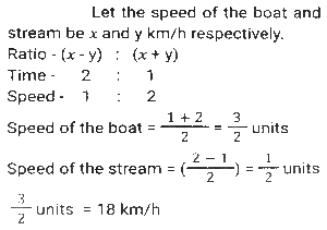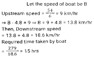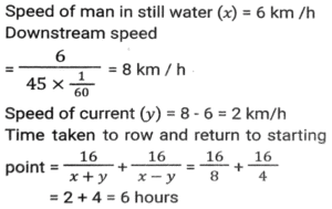 Boat and StreamTotal Questions: 5021. A boat can go 54 km upstream in 6 hours. If the speed of the stream is 4.8 km/h, then how much time (in hours) will the boat take to cover a distance of 279 km downstream? [SSC CGL 11/09/2024 (3rd Shift)](a) 20(b) 15(c) 18(d) 16Correct Answer: (b) 15Solution:22. A boatman goes 2 km against the current of the stream in 1 hour and goes 1 km along with the current in 10 minutes. How long will it take to go 6 km in stationary water? [SSC CGL 12/09/2024 (3rd Shift)](a) 1 hr 30 min(b) 1 hr 15 min(c) 2 hr 30 min(d) 1 hr 45 minCorrect Answer: (a) 1 hr 30 minSolution:23. A boat can travel 78 km upstream and back in a total of 32 hours. It can travel 15 km upstream and 52 km downstream in a total of 9 hours. How much distance will the boat cover in 12 hours in still water? [SSC CGL 13/09/2024 (1st Shift)](a) 92 km(b) 96 km(c) 104 km(d) 100 kmCorrect Answer: (b) 96 kmSolution:24. A boatman rows to a place 30 km distant and back in 14 hours. He finds that he can row 10 km with the stream at the same time as 4 km against the stream. Find the speed (in km/h) of the stream. [SSC CGL 13/09/2024 (3rd Shift)](a) 9/2(b) 9/4(c) 2/9(d) 4/9Correct Answer: (b) 9/4Solution:25. A motorboat travelling at some speed can cover 24 km upstream and 40 km downstream in 17 hours. At the same speed it can travel 32 km downstream and 12 km upstream in 10 hours. The speed of the stream is: [SSC CGL 18/09/2024 (1st Shift)](a) 5 km/h(b) 4 km/h(c) 2 km/h(d) 3 km/hCorrect Answer: (d) 3 km/hSolution:Let speed of boat in still water = xkm/h Speed of stream = y km/h 26. A man can row a distance of 6 km in 1 hour in still water. He can row the same distance in 45 minutes with the current. Find the total time taken by him to row a distance of 16 km with the current and to return to the starting point. [SSC CGL 18/09/2024 (3rd Shift)](a) 4 hours and 40 minutes(b) 6 hours(c) 4 hours(d) 6 hours and 40 minutesCorrect Answer: (b) 6 hoursSolution:27. A motorboat, whose speed is 15 km/h in still water, goes 50 km downstream and comes back in a total of 7 hours 30 minutes. The speed of the stream (in km/h) is: [SSC CGL 23/09/2024 (2nd Shift)](a) 9(b) 5(c) 11(d) 7Correct Answer: (b) 5Solution:28. A boat covers a distance of 55 km downstream in 5 hours while it takes 11 hours to cover the same distance upstream. What is the speed of the boat? [SSC CGL 23/09/2024 (3rd Shift)](a) 8 km/h(b) 9 km/h(c) 11 km/h(d) 7 km/hCorrect Answer: (a) 8 km/hSolution:29. A man can row 18 km/h in still water. It takes him two times as long to row up as to row down the river. Find the rate of the stream. [SSC CHSL 01/07/2024 (3rd Shift)](a) 9 km/h(b) 12 km/h(c) 24 km/h(d) 6 km/hCorrect Answer: (d) 6 km/hSolution:30. A boat can travel 60km downstream in 4 hours. If the speed of the boat in still water is 13 km/h, then in what time will it cover 30 km upstream? [SSC CHSL 02/07/2024 (1st Shift)](a) 3⁵⁄₇ hours(b) 3⁴⁄₇ hours(c) 2⁴⁄₇ hours(d) 2⁸⁄₁₁ hoursCorrect Answer: (d) 2⁸⁄₁₁ hoursSolution:Submit Quiz« Previous12345Next »