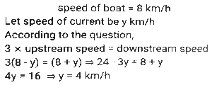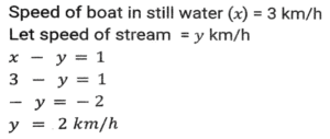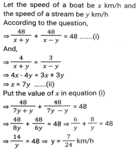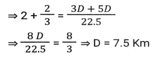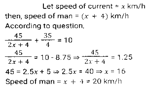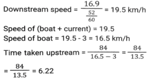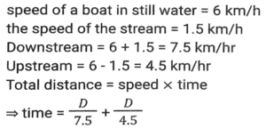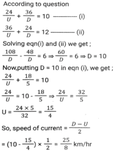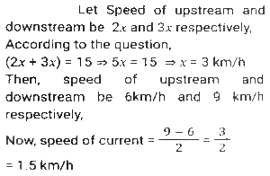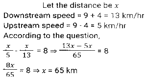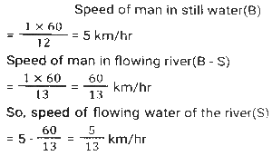Boat and StreamTotal Questions: 5031. The ratio of the speeds of a boat while going upstream and going downstream is 2 : 3 and the sum of these two speeds is 15 km/h. What is the speed of the stream? [SSC CHSL 08/07/2024 (2nd Shift)](a) 3.5 km/h(b) 1.5 km/h(c) 3 km/h(d) 2.5 km/hCorrect Answer: (b) 1.5 km/hSolution:32. A man can row a boat at speed 8 km/h in still water. It takes thrice as long to row upstream as it does to row downstream. Find the speed of the stream (inkm/h). [SSC CHSL 08/07/2024 (4th Shift)](a) 6(b) 4(c) 5(d) 3Correct Answer: (b) 4Solution:33. If the speed of a boat in still water is 3 km/h and if its speed upstream is 1 km/h, find the speed of the stream. [SSC CHSL 11/07/2024 (3rd Shift)](a) 0.25 km/h(b) 1 km/h(c) 2 km/h(d) 0.5 km/hCorrect Answer: (c) 2 km/hSolution:34. A man wishes to cover 1 km distance in river water. In still water he takes 12 minutes to cover it, but in the flowing river he takes 13 minutes. The speed of the flowing water of the river is: [SSC CPO 27/06/2024 (1st Shift)](a) 25 km/h(b) 5/13 km/h(c) 22 km/h(d) 7/12 km/hCorrect Answer: (b) 5/13 km/hSolution:35. A man's speed in still water is 4 km/h more than the speed of the current. If the man takes a total of 10 h to cover A 45 km downstream and 35 km upstream, then the speed of the man in still water is: [SSC CPO 27/06/2024 (3rd Shift)](a) 20 km/h(b) 18 km/h(c) 15 km/h(d) 22 km/hCorrect Answer: (a) 20 km/hSolution:36. A boat covers 24 km upstream and 36 km, downstream in 10 hours, and 36 km' upstream and 24 km downstream in 12 hours. The speed of the current is: [SSC CPO 28/06/2024 (1st Shift)](a) 26/9 km/h(b) 33/13 km/h(c) 25/8 km/h(d) 24/7 km/hCorrect Answer: (c) 25/8 km/hSolution:Let the speed of boat be x and speed of stream be y Upstream speed (U) = x-y Downstream speed (D) = x+y 37. A boat can travel 16.9 km downstream in 52 min. If the speed of the current is 3 km/h, then how much time (in hours) will the boat take to travel 84 km upstream? [SSC CPO 29/06/2024 (1st Shift)](a) 6(b) 13.5(c) 6.22(d) 7.5Correct Answer: (c) 6.22Solution:38. A man rows 48 km and back in 48 hours. He can row 4 km with the stream in the same time as 3 km against the stream. The speed of the stream (in km/h) is: [SSC CPO 29/06/2024 (2nd Shift)](a) 5/21(b) 7/21(c) 7/24(d) 3/29Correct Answer: (c) 7/24Solution:39. A man can row 9 km/h in still water. If the river is running at 4 km/h, it takes 8 hours more in upstream than to go downstream for the same distance. How far is the place? [Matriculation Level 24/06/2024 (Shift-1)](a) 65 km(b) 60 km(c) 75 km(d) 55 kmCorrect Answer: (a) 65 kmSolution:40. The speed of a boat in still water is 6 km/h and the speed of the stream is 1.5 km/h. In going from point A to point B and returning to A, the boatman takes 2 hours 40 min. Find the distance between points A and B. [Higher Secondary 24/06/2024 (Shift-2)](a) 7.5 km(b) 8 km(c) 7 km(d) 8.5 kmCorrect Answer: (a) 7.5 kmSolution:Submit Quiz« Previous12345Next »