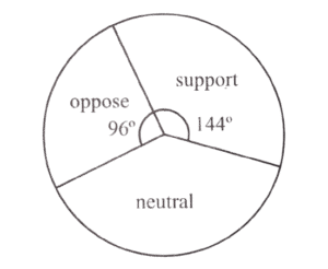 6. A campus poll covering 300 under-graduate students was conducted in order to study the students' attitude towards a proposed change in the rules for hostel accommodation. The students were required to respond as 'support', 'neutral' or 'oppose' with regard to the issue. The poll outcome was presented as a pie chart as given below :