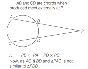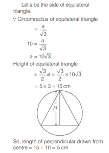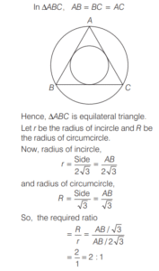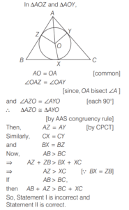 CIRCLE (CDS)Total Questions: 4641. For a triangle, the radius of the circumcircle is double the radius of the inscribed circle, then which one of the following is correct?(a) The triangle is a right angled(b) The triangle is an isosceles(c) The triangle is an equilateral(d) None of the aboveCorrect Answer: (c) The triangle is an equilateralSolution:42. Let the incircle to a ∆ABC touch BC, AC and AB respectively at the points X, Y and Z.Statement I If AB > BC, then AB + AZ < BC + XC Statement II AZ = AYWhich one of the following is correct in respect of the above statements?(a) Statements I and II are correct and Statement II is the correct explanation of Statement I(b) Statements I and II are correct and Statement II is not the correct explanation of Statement I(c) Statement I is correct and Statement II is incorrect(d) Statement I is incorrect and Statement II is correctCorrect Answer: (d) Statement I is incorrect and Statement II is correctSolution:43. Let ABC be a triangle in which ∠ACB = 60° and AC = x < BC. Let the circle with centre at C and radius x meet BC at D. Let CF be the perpendicular drawn from C meeting AD at F.Statement I ∆ACD is isosceles but not equilateral. Statement II DF = x/2Which one of the following is correct in respect of the above statements?(a) Statements I and II are correct and Statement II is the correct explanation of Statement I(b) Statements I and II are correct and Statement II is not the correct explanation of Statement I(c) Statement I is correct and Statement II is incorrect(d) Statement I is incorrect and Statement II is correctCorrect Answer: (d) Statement I is incorrect and Statement II is correctSolution:44. A circle of radius 10 cm has an equilateral triangle inscribed in it. The length of the perpendicular drawn from the centre to any side of the triangle is(a) 2.5√3 cm(b) 5√3 cm(c) 10√3 cm(d) None of the aboveCorrect Answer: (d) None of the aboveSolution:45. AB and CD are two chords of a circle meeting externally at P. Then, which of the following is/are correct?I. PA PD = PC × PB II. ∆ PAC and ∆ PDB are similar.Select the correct answer using the codes given below.(a) Only I(b) Only II(c) Both I and II(d) Neither I nor IICorrect Answer: (d) Neither I nor IISolution:46. In a ∆ABC, AB = BC = CA. The ratio of the radius of the circumcircle to that of the incircle is(a) 2 : 1(b) 3 : 1(c) 3 : 2(d) None of theseCorrect Answer: (a) 2 : 1Solution:Submit Quiz« Previous12345