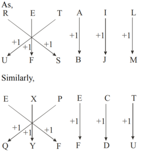 CODING & DECODING (General Mental Ability) UPSC EPFOTotal Questions: 3111. If 'A' is substituted by 1, 'B' by 2 and so on upto 'Z' which is substituted by 26, what will be, the sum of the numbers substituted for the word DECAY?(a) 38(b) 41(c) 40(d) 37Correct Answer: (a) 38Solution:12. If AMONG is written as NAOGM and SPINE is written as NSIEP, then LAMON will be written as(a) OALNM(b) MLONA(c) OLMNA(d) OLNMACorrect Answer: (c) OLMNASolution:13. In a certain code RETAIL is written as UFSBJM, how is EXPECT written in that code?(a) FQYFDU(b) QYFIJOF(c) FYQFDU(d) QYFFDUCorrect Answer: (d) QYFFDUSolution:14. In a certain code NAMES is written as TFNBO.'How is CRANE written in that code ?(a) FMBQD(b) DSBOF(c) FOBSD(d) FBODSCorrect Answer: (c) FOBSDSolution:15. In a certain code DAYLONG is written as ZBEKHOP. How is CORDIAL written in that code?(a) SPDCMBJ(b) SPDEMBJ(c) DPSCMBJ(d) SPDCJBMCorrect Answer: (a) SPDCMBJSolution:16. In a certain code language 'do re me' means 'he is late', 'fa me la' means `she is early' and 'so ti do' means 'he leaves soon'. Which code in that language means 'late'?(a) la(b) do(c) me(d) None of theseCorrect Answer: (d) None of theseSolution:17. In a certain code 'MOTHER' is written as OMHURF. How will 'ANSWER' be written in that code ?(a) NBWRRF(b) MAVSPE(c) NBWTRD(d) NBXSSECorrect Answer: (d) NBXSSESolution:18. In a certain code DUPLICATE is written as MRV FJFVBE. How is CARTOUCHE written in that code?(a) UTBEPWDJF(b) UTBFQFJDW(c) UTBEQFJDW(d) UTBEPFJDWCorrect Answer: (d) UTBEPFJDWSolution:19. In a certain code CHITON is written as IHCNOT. How will DILATE be written in that code?(a) ETALID(b) LIDATE(c) LIDETA(d) ETADILCorrect Answer: (c) LIDETASolution:20. lf 8 is written as B, 1 as R, 6 as K, 9 as O, 4 as M, 7 as W and 3 as T, then how, would WROMBT be Written in the numeric form?(a) 714983(b) 719483(c) 769483(d) 719486Correct Answer: (b) 719483Solution:W R O M B T → 7 1 9 4 8 3Submit Quiz« Previous1234Next »