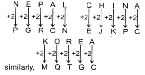 Coding Decoding – Railway Reasoning part – IXTotal Questions: 5011. In a certain code language, TENSION is written as 183121771312, How will MARUTHI be written as in that language? [RRB NTPC 11/02/2021 (Evening)](a) 112516191867(b) 671125161918(c) 111625911867(d) 111925161786Correct Answer: (a) 112516191867Solution:The code for MARUTHI = 11251619186712. In a certain code language, STYLE is written as JBGC. How will HOUND be written as in that language? [RRB NTPC 12/02/2021 (Morning)](a) QPMNF(b) BVSTP(c) XWKED(d) HFCEDCorrect Answer: (d) HFCEDSolution:S = 19 , (sum of the digit )= 1 + 9 = 10 , 10 = JT = 20 , 2 + 0 = 2 , and 2 = BY = 25 , 2 + 5 = 7 , and 7 = GL = 12 , 1 + 2 = 3 , and 3 = CE = 5 , AND 5 = ESimilarly, HOUND is written as HFCED.13. If Flower = 8, Water = 7, Too = 5, Most = 6 and Tree = 6, then Interdependence will be equal to: [RRB NTPC 12/02/2021 (Morning)](a) 18(b) 30(c) 17(d) 15Correct Answer: (c) 17Solution:Flower = Number of word + 2 = 6 + 2 = 8Similarly, Interdependence = number of word + 2 = 15 + 2 = 1714. If N = 13 and L = 15, then NATIONAL = ? [RRB NTPC 12/02/2021 (Morning)](a) 132671412132615(b) 132671212132615(c) 132671712132615(d) 132671812132615Correct Answer: (d) 132671812132615Solution:Using the opposite place.15. In a certain code language, NEPAL is written as PGRCN and CHINA is written as EJKPC. How will KOREA be written as in that language? [RRB NTPC 15/02/2021 (Morning)](a) LPSGC(b) JNQGC(c) NCEGC(d) MQTGCCorrect Answer: (d) MQTGCSolution:16. In a certain code language, [RRB NTPC 15/02/2021 (Morning)]‘Sharks are fish’ is written as ‘@ # mt’,‘Fish eat food’ is written as ‘lu mt ak’,‘Sharks eat fish’ is written as ‘mt ak @’.What is the code for ‘Sharks’ in that code language?(a) mt(b) lu(c) ak(d) @Correct Answer: (d) @Solution:17. In a certain code language, IDIOT is written as RWRLG. How will RAIN be written in that language? [RRB NTPC 15/02/2021 (Morning)](a) IZRL(b) GERM(c) GFRO(d) IZRMCorrect Answer: (d) IZRMSolution:Opposite of the letters are written. 18. In a certain code language, DOOR is written as FRSW. How will FAN be written as in the code language? [RRB NTPC 15/02/2021 (Evening)](a) HDR(b) HBP(c) GBO(d) NAFCorrect Answer: (a) HDRSolution:D + 2 = F, O + 3 = RO + 4 = S, R + 5 = WSimilarly FAN will be coded as HDR19. In a certain code language, PEN is written as 16514. How will INK be written in that language? [RRB NTPC 15/02/2021 (Evening)](a) 91411(b) 91310(c) 101411(d) 911311Correct Answer: (a) 91411Solution:Using the place value of the alphabet.20. In a certain code language PHEM is written as NEAH and PIST is written as NFOO. [RRB NTPC 16/02/2021 (Morning)]How will ZULO be written as in that language?(a) YQHK(b) XRHJ(c) YSIK(d) XSJUCorrect Answer: (b) XRHJSolution:Submit Quiz« Previous12345Next »