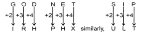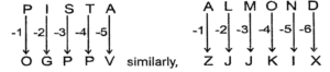 Coding Decoding – Railway Reasoning part – IXTotal Questions: 5021. In a certain code language GOD is written as IRH and NET is written as PHX. How will SIP be written in that language? [RRB NTPC 16/02/2021 (Morning)](a) UKR(b) UTL(c) ULT(d) VLSCorrect Answer: (c) ULTSolution:22. In a certain code language, HEART is written as USAFI and CLEANER is written as SFOAFMD. How will SHAMPOO be written as in that language? [In a certain code language, HEART is written as USAFI and CLEANER is written as SFOAFMD. How will SHAMPOO be written as in that language?](a) PQQMBIT(b) TMBMQPP(c) PPQNBIT(d) PQMBMITCorrect Answer: (d) PQMBMITSolution:reverse the word and increase 1 to each alphabet except the middle one.SHAMPOO on reversing becomesOOP - M - AHSOn increasing 1 to each element except the middle one is PPQ - M - BIT.23. In a certain code language, COCKROACH is written as CPENVRCDH and SCOOTER is written as SDQRVFR. How will MESMERIZE be written as in that language? [RRB NTPC 16/02/2021 (Evening)](a) MFUPIJKAE(b) MFUPIUKAE(c) MFUPIURAE(d) MFJPIUKAECorrect Answer: (b) MFUPIUKAESolution:C + 0 = C, O + 1 = PC + 2 = E, K + 3 = NR + 4 = V, O + 3 = RA + 2 = C, H + 0 = H Similarly using same logic MESMERIZE is written MFUPUIUKAE.24. If ‘Urdu’, ‘Sanskrit’, ‘History’, ‘Physics’ and ‘Economics’ are known as ‘Physics’, ‘History’, ‘Urdu’, ‘Economics’ and ‘Sanskrit’, respectively, then in which subject did we study about Newton? [RRB NTPC 17/02/2021 (Morning)](a) History(b) Physics(c) Urdu(d) EconomicsCorrect Answer: (d) EconomicsSolution:We studied about Newton in physics and physics is called Economics.25. In a certain code language ‘PINTEREST’ is written as ‘LEJPANAOP’. How will ‘VIBER’ be written in language? [RRB NTPC 17/02/2021 (Evening)](a) RXAEN(b) RXEAN(c) REAXN(d) REXANCorrect Answer: (d) REXANSolution:Given alphabets - 4 P - 4 = L, I - 4 = E...Code for VIBER = REXAN26. In certain code languages, STAR is coded as 3782 and PLANE is coded as 51804. How will SALE be coded as in that language? [RRB NTPC 17/02/2021 (Evening)](a) 3418(b) 3841(c) 3148(d) 3814Correct Answer: (d) 3814Solution:From the given example we can observe that the code forS = 3, A = 8, L = 1, E = 4The code for SALE = 381427. In a certain code language, COMPUTER is written as 31191267218 and PHONE is written as 12511142. How will MOTHER be written in the same code language? [RRB NTPC 22/02/2021 (Morning)](a) 91175218(b) 91121875(c) 91171852(d) 91172518Correct Answer: (a) 91175218Solution:Direct coding used.From the given examples we can observe that the code for M = 9, O = 11,T = 7, H = 5, E = 2, R = 18Code for MOTHER = 9117521828. In a code language if QUESTION is coded as PRTVDFRTSUHJNPMO, then how will ANSWER be coded? [RRB NTPC 22/02/2021 (Morning)](a) ZBMORTVXDFQS(b) ZABABCNMONOPQRSSTUWSQ(c) OMNJHUSTRFDVTRP(d) REWSNACorrect Answer: (a) ZBMORTVXDFQSSolution:In coding previous and next letters are written.Code for ANSWER = ZBMORTVXDFQS29. In a certain code language, L is written as 15 and T is written as 7. How will LATER be written as in that language? [RRB NTPC 22/02/2021 (Evening)](a) 15267229(b) 15137229(c) 15237229(d) 15247229Correct Answer: (a) 15267229Solution:Position value of opposite letter is written.LATER = OZGVI = 1526722930. In a certain code language, PISTA is written OGPPV. How will ALMOND be written as in that language? [RRB NTPC 23/02/2021 (Morning)](a) VMNPOE(b) ZJJIJY(c) ZJJKIX(d) VKKLDMCorrect Answer: (c) ZJJKIXSolution:Submit Quiz« Previous12345Next »