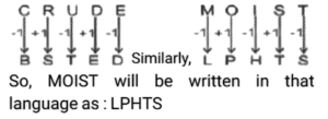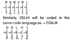 Coding Decoding – Railway Reasoning part – VTotal Questions: 5031. In a certain code language, DESTINY is written as YNITSED. [RRB NTPC 04/01/2021 (Evening)]How will DIGNITY be written as in the language?(a) YGITNID(b) YIGTIND(c) YTINGID(d) YINGTIDCorrect Answer: (c) YTINGIDSolution:32. In a certain code language, VAGABOND is written as NDVABOGA. [RRB NTPC 04/01/2021 (Evening)]How will PRACTICE be written as in that language?(a) CEPRTIAC(b) CEACTIPR(c) PRCETIAC(d) CERPTIACCorrect Answer: (a) CEPRTIACSolution:33. If in a certain code language, REWARI is coded as TGYCTK, [RRB NTPC 05/01/2021 (Morning)]then how is DELHI coded in the same code language?(a) FGNJK(b) FGMJK(c) FGOJK(d) FGLJKCorrect Answer: (a) FGNJKSolution:34. In a certain code language, CRUDE is written as BSTED. [RRB NTPC 05/01/2021 (Morning)]How is MOIST written in that language?(a) NNJRU(b) LPHTS(c) LNHRS(d) NPJTUCorrect Answer: (b) LPHTSSolution:35. If the position of a letter in the English alphabet is the value of the letter, then what will be the total of all the letters in the word EXAGGERATION? [RRB NTPC 05/01/2021 (Evening)](a) 136(b) 134(c) 132(d) 126Correct Answer: (d) 126Solution:EXAGGERATION= 5 + 24 + 1 + 7 + 7 + 5 + 18 + 1 + 20 + 9 + 15 + 14 = 12636. In a certain code language, FRAGRANCE is written as ESZHQBMDD. [RRB NTPC 05/01/2021 (Evening)]How will EXCELLENCE be written as in that language?(a) DYBFKMDOBF(b) DYBYMKDOBF(c) DYBFKMDQBF(d) DYBFKMDPBFCorrect Answer: (a) DYBFKMDOBFSolution:37. In a certain code language, REGULATION is written as QDFTKZSHNM. [RRB NTPC 05/01/2021 (Evening)]How will SYMPOSIUM be written as in that language?(a) RXLONRHTL(b) RXLONRHVL(c) RXLONRHTL(d) RXLONRJTLCorrect Answer: (c) RXLONRHTLSolution:38. In a certain code, ‘best way to win’ is written as ‘fa ka la ju’, ‘the way to hell’ is written as ‘lu la hu fa’, ‘win of the day’ is written as ‘na lu fa ka’, and ‘to sell of night’ is written as ‘na li ya la’. Which of the following represents ‘of the way’? [RRB NTPC 05/01/2021 (Morning)](a) lu na ya(b) lu na fa(c) ka lu na(d) na ka faCorrect Answer: (b) lu na faSolution:After comparing all the lines,we get ⇒ the = lu, of = na, way = faSo, “of the way” will be written as⇒ ‘lu na fa’39. In a certain code language, PAINT is coded as 83527 and SCORE is coded as 49061. [RRB NTPC 07/01/2021 (Morning)]How would you code RECENT in the same language?(a) 190985(b) 648497(c) 619127(d) 921235Correct Answer: (c) 619127Solution:In a certain code language PAINT is coded as 83527 and SCORE is coded as 49061. So, the codes for R = 6, E = 1, C = 9, E = 1, N = 2 and T = 7⇒ the code for RECENT → 61912740. In a certain code, MAD = 56, CAT = 80. [RRB NTPC 07/01/2021 (Evening)]Then, what will DEN = ?(a) 29(b) 126(c) 100(d) 208Correct Answer: (b) 126Solution:MAD = (13 + 1) × 4 = 56CAT = (3 + 1) × 20 = 80DEN = (4 + 5) × 14 = 126Submit Quiz« Previous12345Next »