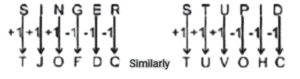 Coding Decoding – Railway Reasoning part – VITotal Questions: 5041. If BALL is coded as OBEY COMA LORD GULF**, then what code can be considered for KITE? [RRB NTPC 16/01/2021 (Morning)](a) SKY BRAIN TABLE GOES(b) SKIN ORBIT TOTAL ENTER(c) SKILL ROBIN TELL GOAT(d) SKIP OPTIC TOOL GETCorrect Answer: (c) SKILL ROBIN TELL GOATSolution:In the given code, B is at the 2nd place of 1st word, A is at the 4th place of the 2nd word, L is at the 1st place in 3rd word and L is at the 3rd place of last word. KITE = SKY BRAIN TABLE GOES42. In a certain code language, A is written as 26 and O is written as 12. How will AMAZON be written as in that language? [RRB NTPC 16/01/2021 (Evening)](a) 261226111213(b) 261426111213(c) 261526111213(d) 261326111213Correct Answer: (b) 261426111213Solution:This question is solved on the basis of opposite face value. AMAZON = 26142611121343. In a certain code, LOTUS is written as KPSVR. How can WATER be written in that code? [RRB NTPC 16/01/2021 (Evening)](a) UBFSQ(b) VBFSQ(c) VBFSQ(d) UQSG BCorrect Answer: (c) VBFSQSolution:L - 1 = K, O + 1 = P, T - 1 = S, U + 1 = V, S - 1 = R Similarly, WATER = VBSFQ44. If CHARGER is coded as 129, then HINGES will be coded as: [RRB NTPC 16/01/2021 (Evening)](a) 99(b) 100(c) 102(d) 101Correct Answer: (b) 100Solution:Sum of place values opposite of the letters. CHARGER = 24 + 19 + 26 + 9 + 20 + 22 + 9 = 129 HINGES = 19 + 18 + 13 + 20 + 22 + 8 = 10045. PI = Y and SD = W, then find GN = ? [RRB NTPC 16/01/2021 (Evening)](a) V(b) Z(c) X(d) UCorrect Answer: (d) USolution:PI = Y → 16 + 9 = 25 SD = W → 19 + 4 = 23 So that GN = 7 + 14 = 21 Place value of 21 is U46. If ‘cooler’ is called ‘food’, ‘food’ is called ‘rose’, ‘rose’ is called ‘restaurant’, and ‘restaurant’ is called ‘Natkhat’, then what would a man eat? [RRB NTPC 17/01/2021 (Morning)](a) Rose(b) Natkhat(c) Restaurant(d) CoolerCorrect Answer: (a) RoseSolution:Man eats food and food is called rose.47. In a certain code language MOHRA is written as 73541 and KALINGA is written as 2168901. How will HARLIN be written as in that language? [RRB NTPC 17/01/2021 (Morning)](a) 568914(b) 541869(c) 514689(d) 514986Correct Answer: (c) 514689Solution:Here, we have to find code for each letter from the given examples. H = 5, A = 1, R = 4, L = 6, I = 8, N = 9 Code for ‘HARLIN’ = 51468948. If ACE = 35, AGED = 91, then CARE = ? [RRB NTPC 17/01/2021 (Evening)](a) 288(b) 359(c) 358(d) 323Correct Answer: (b) 359Solution:ACE = 1² + 3² + 5² = 35, AGED = 1² + 7² + 5² + 4² = 91, CARE = 3² + 1² + 18² + 5² = 35949. In a certain code language, if SINGER is coded as TJQFDQ, then which of the following will be the code for STUPID in that language? [RRB NTPC 17/01/2021 (Evening)](a) TUVQJE(b) JOQQIE(c) TUVQHC(d) TUQQJECorrect Answer: (c) TUVQHCSolution:50. Which of the following options will mean ‘up’? [RRB NTPC 17/01/2021 (Evening)]In a certain language: ‘Stairs going up’ means QE W ADS ZCW‘How many stairs’ means PIO LJK ADS‘He is going’ means QEW RYT FHG(a) LJK(b) QEW(c) ZCW(d) ADSCorrect Answer: (c) ZCWSolution:In 1st sentence and 3rd sentence, going is common, code for going = QEW. Stairs is common in 1st sentence and 2nd, code for stairs = ADS. Now code for up = ZCW.Submit Quiz« Previous12345