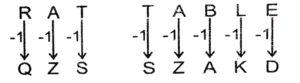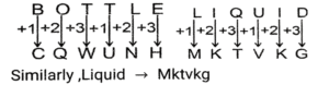 Coding Decoding – Railway Reasoning part – VIIITotal Questions: 501. In a certain code language, GOLDEN CIRCLE is written as 715124514 39183125. How will ENGLAND be written in that language? [RRB NTPC 27/01/2021 (Evening)](a) 5147112114(b) 5174121144(c) 5174111114(d) 5147121144Correct Answer: (d) 5147121144Solution:Place value of alphabets are written.ENGLAND = 51471211442. If T = 7 and Y = 2, then TUESDAY = ? [RRB NTPC 27/01/2021 (Evening)](a) 7642823162(b) 7632824262(c) 7622863462(d) 7622823262Correct Answer: (d) 7622823262Solution:Place value of opposite letter is written.TUESDAY = 76228232623. In a certain code language, EDUCATION is written as 92. How will KNOWLEDGE be written in that language? [RRB NTPC 28/01/2021 (Morning)](a) 101(b) 93(c) 100(d) 96Correct Answer: (d) 96Solution:EDUCATION = 5 + 4 + 21 + 3 + 1 + 20 + 9 + 15 + 14 = 92. Similarly, KNOWLEDGE = 11 + 14 + 15 + 23 + 12 + 5 + 4 + 7 + 5 = 96.4. In a certain code language, VEGETABLE is written as IJKLMNOPQ. How will TABLE be written as in that language? [RRB NTPC 28/01/2021 (Morning)](a) PQNOM(b) MONQP(c) QPONM(d) MNOPQCorrect Answer: (d) MNOPQSolution:direct coding is used.VEGE - TABLE = IJKL - MNOPQHere, table is coded as MNOPQ5. In a certain code language, RAT is written as QZS. How will TABLE be written in that language? [RRB NTPC 28/01/2021 (Morning)](a) SZALE(b) SZADK(c) SZAKD(d) SDAKZCorrect Answer: (c) SZAKDSolution:6. In a certain code language, ROTARY is written as 65. How will CONSCIENCE be written as in that language? [RRB NTPC 28/01/2021 (Morning)](a) 170(b) 150(c) 180(d) 160Correct Answer: (c) 180Solution:R + O + T + A + R + Y → (opposite alphabet) → I + L + G + Z + I + B = 65Similarly, CONSCIENCE is XLMHXRVMXV written as 1807. If Apple = Brspj, and Mango = Ncqkt, then Grapes will be equal to: [RRB NTPC 28/01/2021 (Evening)](a) Hscsjy(b) Hytchk(c) Hdttjy(d) GsbqduCorrect Answer: (c) HdttjySolution:A + 1 = B, p + 2 = r, p + 3 = s, I + 4 = p, e + 5 = jSimilarlyGrapes → Htdtjy8. If ORANGE is coded as QOCKIB, how will FELLOW be coded as? [RRB NTPC 28/01/2021 (Evening)](a) HBINTQ(b) HBNIQT(c) HNIBTQ(d) HNBIQTCorrect Answer: (b) HBNIQTSolution:ORANGE is coded as QOCKIBO + 2 = Q , R - 3 = O , A + 2 = C , N - 3 = K ,G + 2 = I , E - 3 = BSimilarly, FELLOW be coded as HBNIQT9. In a certain language, Bottle is written as Cqwunh. How will Liquid be written in that language? [RRB NTPC 28/01/2021 (Evening)](a) Mktzmj(b) Mkthgb(c) Mktvgk(d) MktvkgCorrect Answer: (d) MktvkgSolution:10. In certain languages CUP is coded as 295 and CAKE is coded as 2476. How will PACK be coded in that language? [RRB NTPC 29/01/2021 (Morning)](a) 5472(b) 5427(c) 5742(d) 5274Correct Answer: (b) 5427Solution:From the given examples, we can observe that P → 5, A → 4, C → 2 and K → 7 Code for PACK → 5427Submit Quiz12345Next »