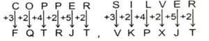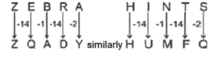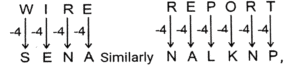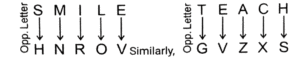 Coding Decoding – Railway Reasoning part – VIIITotal Questions: 5011. In a certain language SMILE is coded as HNROV, how will TEACH be coded in that language? [RRB NTPC 29/01/2021 (Morning)](a) GZVXS(b) GVZXS(c) GSZVX(d) GXVSZCorrect Answer: (b) GVZXSSolution:12. In a code language, COPPER is written as FQTRJT then how will SILVER be written as in that code language? [RRB NTPC 29/01/2021 (Evening)](a) VOPYTJ(b) UJQMJT(c) WJNXTJ(d) VKPXJTCorrect Answer: (d) VKPXJTSolution:13. If WIRE is coded as SENA, then REPORT will be coded as? [RRB NTPC 30/01/2021 (Morning)](a) VOPYTJ(b) UJQMJT(c) WJNXTJ(d) VKPXJTCorrect Answer: (c) WJNXTJSolution:14. If Charger = 60, then Topper = ? [RRB NTPC 30/01/2021 (Morning)](a) 40(b) 52(c) 90(d) 26Correct Answer: (c) 90Solution:Sum of place value of all alphabets.Topper = 20 + 15 + 16 + 16 + 5 + 18 = 9015. In a certain code language, CRICKET is written as ZOFZHBQ. How will FOOTBALL be written as in that language? [RRB NTPC 30/01/2021 (Evening)](a) CLLPZXII(b) CLLQYXII(c) XMMRZYJJ(d) CLLQYYJJCorrect Answer: (b) CLLQYXIISolution:16. In a certain code language, UNIVERSITY is written as EVINUYTISR. How will TEMPRATURE be written as in that language? [RRB NTPC 30/01/2021 (Evening)](a) RPMETERUTA(b) ATURETEMPR(c) ETPMARUTER(d) ERUTARPMETCorrect Answer: (a) RPMETERUTASolution:17. If a code of UNSCRAMBLE is GPXYTFNDZV, what will be the code of MARBLES? [RRB NTPC 31/01/2021 (Morning)](a) YNTVFXR(b) GPTDVZX(c) SXYZVNP(d) NFTDZVXCorrect Answer: (d) NFTDZVXSolution:Direct coding is usedThe code for M = N, A = F,R = T, B = D, L = Z, E = V, S = XThe code for MARBLES = NFTDZVX18. In a certain code language, 15789 is written as XTZAL and 2346 is written as NPSU. How will 98216 be written as in that language? [RRB NTPC 31/01/2021 (Morning)](a) LANXU(b) LAXUN(c) LAXNU(d) LANUXCorrect Answer: (a) LANXUSolution:Using the direct coding, we can observe that the code for9 = L, 8 = A, 2 = N, 1 = X, 6 = UThe code for 98216 = LANXU19. If in a certain language 14516112 is the code of NEPAL then what will be the code of INDIA? [RRB NTPC 31/01/2021 (Morning)](a) 114499(b) 914491(c) 994411(d) 149149Correct Answer: (b) 914491Solution:Place value of all letters are written.I = 9, N = 14, D = 4, I = 9 and A = 1Code for INDIA = 91449120. In a certain code language, ZEBRA is written as ZQADY. How will HINTS be written in that language? [RRB NTPC 31/01/2021 (Evening)](a) HUMFQ(b) HVMQF(c) HTMFQ(d) HSFQMCorrect Answer: (a) HUMFQSolution:Submit Quiz« Previous12345Next »