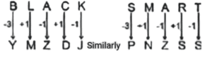 Coding Decoding – Railway Reasoning part – VIIITotal Questions: 5021. In a code language, BLACK is written as YMZDJ. Which word will be coded as PNZSS in that language? [RRB NTPC 31/01/2021 (Evening)](a) SMART(b) SOUTH(c) WORTH(d) WHITECorrect Answer: (a) SMARTSolution:22. If GARLIC be coded as 112 then CLOCK will be coded as: [RRB NTPC 31/01/2021 (Evening)](a) 111(b) 101(c) 81(d) 91Correct Answer: (d) 91Solution:Sum of place value of opposite lettersCLOCK = 24 + 15 + 12 + 24 + 16 = 9123. In a certain code language, SYLLABUS is written as SLYLAUBS. How will BACKYARD be written as in that code? [RRB NTPC 31/01/2021 (Evening)](a) BCYARAKD(b) ABKACAYDR(c) ABCKYADR(d) BCAYKRADCorrect Answer: (d) BCAYKRADSolution:24. In a certain code language, 'Tuesday is sunny' is written as 'CNG', 'Sunny loves ice-cream' is written as 'PGD', 'Ice-cream melts fast' is written as 'PWL' and 'Jack runs fast' is written as 'LAT'. Which of the options below would most likely be used to write 'Sunny bowls fast' in that language? [RRB NTPC 01/02/2021 (Morning)](a) PLD(b) GDP(c) GXL(d) GLPCorrect Answer: (c) GXLSolution:25. In a certain code language, LAUGHTER is written as MBVHIUFS, How will 'DEPRESSION' be written in that language? [RRB NTPC 01/02/2021 (Evening)](a) EFQSFTTJPO(b) EFSFTQTJPO(c) EFQSFTJPTO(d) EFQSJPOFTTCorrect Answer: (a) EFQSFTTJPOSolution:26. If LIT is coded as 123, LEFT is coded as 4512 and YELL is coded as 2247, then what will be the code for FLY? [RRB NTPC 02/02/2021 (Morning)](a) 741(b) 527(c) 475(d) 623Correct Answer: (b) 527Solution:From the given example we can observe that code for F = 5, L = 2, Y = 7So the code for FLY = 527.27. In a certain code language, ‘924’ means ‘they like tomato,’ ‘935’ means ‘we love tomato’ and ‘956’ means ‘tomato love mango’. Which digit is used for ‘mango’? [RRB NTPC 02/02/2021 (Morning)](a) 2(b) 9(c) 4(d) 6Correct Answer: (d) 6Solution:28. In a certain code, UNSURE is written as ELGEHU, which of the following will be written as YNYHM in the same code? [RRB NTPC 02/02/2021 (Morning)](a) TELGU(b) ALONE(c) ALARM(d) MONEYCorrect Answer: (c) ALARMSolution:Opposite of the letter - 1 YNYHM = ALARM29. In a certain code language, ALBINISM is written as 79. How will NEURON be written in that code? [RRB NTPC 02/02/2021 (Evening)](a) 87(b) 98(c) 45(d) 39Correct Answer: (a) 87Solution:Sum of the alphabet place value.A + L + B + I + N + I + S + M= 1 + 12 + 2 + 9 + 14 + 9 + 19 + 13 = 79Similarly, NEURON = 8730. In a certain code language, BAYWATCH is written as ZYWUYRAF. How will EFRON be written in that code? [RRB NTPC 02/02/2021 (Evening)](a) CDPML(b) DEQNO(c) BCOLK(d) DCOLNCorrect Answer: (a) CDPMLSolution:Subtracting 2 with all alphabetic place values.So we get CDPML.Submit Quiz« Previous12345Next »