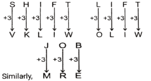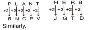 Coding Decoding – Railway Reasoning part – XTotal Questions: 5011. If the word ‘HONEST’ is coded as IPOFTU, then how will the word ‘SISTER’ be coded? [RRB NTPC 08/03/2021 (Morning)](a) TJTUFS(b) FTIUPO(c) JJUTFS(d) RITSESCorrect Answer: (a) TJTUFSSolution:12. In a code language, SHIFT is written as VKLIW and LIFT is written as OLIW. How will JOB be written as in that code language? [RRB NTPC 08/03/2021 (Morning)](a) OSG(b) MRE(c) LQD(d) NSFCorrect Answer: (b) MRESolution:13. If FHB = 36644, then DAG will be equal to… [RRB NTPC 08/03/2021 (Morning)](a) 16444(b) 16212(c) 16149(d) 16330Correct Answer: (c) 16149Solution:As F - H - B = 36 - 64 - 4 ;Here F - 6 ⇒ 6² = 36 , H - 8 ⇒ 8² = 64 ,B - 2 ⇒ 2² = 4 ;Similarly :D - 4 ⇒ 4² = 16 , A - 1 ⇒ 1² = 1 ,G - 7 ⇒ 7² = 49 ;So, DAG : 1614914. In a certain code language, BRIDE is written as FVMHL. How will SINGLE be written as in that language? [RRB NTPC 08/03/2021 (Evening)](a) WMRJPO(b) WNRKPI(c) WMRJPK(d) WMRKPICorrect Answer: (d) WMRKPISolution:B + 4 = F , R + 4 = V , I + 4 = M , D + 4 = H ,E + 4 = ISimilarly , SINGLE is written as WMRKPI15. In a certain code language, SUCCESS is written as HVXVDTH and LOVELY is written as OPEFOZ. How will EXTREME be written as in that language? [RRB NTPC 08/03/2021 (Evening)](a) VYGSVNV(b) YVVHNV(c) VUYSVNV(d) VYUHGHCorrect Answer: (a) VYGSVNVSolution:S = H (opposite place value) , U + 1 = V ,C = X (opposite place value)C + 1 = D , E = V (opposite place value) ,S + 1 = T , S =H (opposite place value)Similarly, EXTREME will be written asVYGSVNV16. In a certain code language, PERMANENT is written as RFPNBMTOE and AUTHORITY is written as TVARPHYUI. How will ESTABLISH be written as in that language? [RRB NTPC 08/03/2021 (Evening)](a) FTUBCMJTJ(b) TTELCAITH(c) TTEACLHTI(d) TTELCAHTICorrect Answer: (d) TTELCAHTISolution:So , ESTABLISH is written as TTELCAHTI.17. In a certain language, ‘SIT’ is written as ‘RSHIST’, ‘GO’ is written as ‘FGNO’, ‘PEN’ is written as ‘OPDEMN’. How will ‘CUP’ be written in that language? [RRB NTPC 09/03/2021 (Morning)](a) BCOPTU(b) CDTUOP(c) TUOPBC(d) BCTUOPCorrect Answer: (d) BCTUOPSolution:The previous letter of each letteris written first , then the given letter.SIT → (RS)(HI)(ST) → RSHISTGO → (FG)(NO) → FGNOSimilarly,CUP → (BC)(TU)(OP) → BCTUOP18. In a certain code language, PLUS is written as SOXV and LIVE is written as OLYH. How will FREE be written as in that language? [RRB NTPC 09/03/2021 (Evening)](a) JVHH(b) IUHI(c) IUHH(d) JVHICorrect Answer: (c) IUHHSolution:P + 3 = S , L + 3 = O , U + 3 = X , S + 3 = VF + 3 = I , R + 3 = U , E + 3 = H , E + 3 = H19. In a code language , PLANT is written as RNCPV, and HERB is written as JGTD. How will FLOWER be written in that code language? [RRB NTPC 11/03/2021 (Morning)](a) HNQYGT(b) EKNVGT(c) DJMUGT(d) GMPZGTCorrect Answer: (a) HNQYGTSolution:20. If in a code language, LIVE is written as OREV, then how will PRAY be written in that code language? [RRB NTPC 11/03/2021 (Morning)](a) KIZB(b) RSBZ(c) LIZB(d) QSBZCorrect Answer: (a) KIZBSolution:Opposite letters arewritten as code.Code for PRAY = KIZBSubmit Quiz« Previous12345Next »