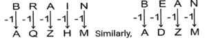 Coding Decoding – Railway Reasoning part – XITotal Questions: 5021. In a certain code language, ARITHMETIC is written as MAITCEHTIRA. How will ALGEBRA be written as in that language? [RRB NTPC 06/04/2021 (Evening)](a) BRAEGLA(b) ALGEARB(c) ARBEGLA(d) GLAEBRACorrect Answer: (a) BRAEGLASolution:22. In a certain code language, MONO LATERALS is written as NMOAOLRTESAL. How will ABRACADABRAS be written in that code? [RRB NTPC 07/04/2021 (Morning)](a) RABACABDASRA(b) RABACBADASRA(c) RBACABADASR(d) SARBADACABRACorrect Answer: (a) RABACABDASRASolution:23. In certain code language. PETAL is coded as 11-22- 7-26-15. How will UNDER be coded in that language? [RRB NTPC 07/04/2021 (Evening)](a) 6-13-23-5-18(b) 6-14-4-22-9(c) 6-13-23-22-9(d) 6-14-4-22-18Correct Answer: (c) 6-13-23-22-9Solution:Place value of opposite letters.∴ UNDER = FMWVI (6 -13 - 23 - 22 - 9)24. Which of the following codes is used to write the word ENQUIRY as FLTQNLF? [RRB NTPC 08/04/2021 (Morning)]The word RESERVATION has beencoded using 4 different codes.Code 1 : SGVIWBBHRYYCode 2 : SCVAVPHLREYCode 3 : TGUGTXCVKQPCode 4 : PCCQPTYRGML(a) Code 2(b) Code 4(c) Code 3(d) Code 1Correct Answer: (a) Code 2Solution:From the given codes we canobserve that in code 2Code for R = R + 1 = SCode for E = E - 2 = CCode for S = S + 3 = V and so onAnd code for ENQUIRY = FLTQNLF iscoded according to code 2.25. Which of the following codes is used to write the word STATION as RUZUHPM? [RRB NTPC 08/04/2021 (Morning)]The word LOCOMOTIVE has beencoded using 4 different codes.Code 1 : KMZKHIMAMUCode 2 : MNDNNNUHWDCode 3 : KPBPLPSJUFCode 4 : MQFSRUAQEO(a) Code 1(b) Code 3(c) Code 4(d) Code 2Correct Answer: (b) Code 3Solution:In LOCOMOTIVE , According to givencode 3, the code ofLOCOMOTIVE =KPBPLPSJU(+1 , -1 , +1 , -1 , +1 , -1 , so on)and in code of STATION , the code ofRUZUHPM is same26. In a certain code language, BRAIN is written as AQZHM. How will BEAN be written as in that code language? [RRB NTPC 08/04/2021 (Morning)](a) NSDE(b) SNED(c) ADZM(d) OPSUCorrect Answer: (c) ADZMSolution:27. In a code language, PUN is written as ‘OQTVMO’ and BOB is written as ‘ACNPAC’. How will LIE be written as in that language? [RRB NTPC 08/04/2021 (Evening)](a) KOLPGY(b) OSJKGG(c) RSIJFG(d) KMHJDFCorrect Answer: (d) KMHJDFSolution:P is middle number , between O and Q .U is middle number , between T and V .N is middle number , between M and OSimilarly ,LIE is written as KMHJDF28. In a code language, AROMA is written as ‘@%U@S’, ELE is written as ‘DD#’ and ROSE is written as ‘%$D^’. How will MAREO be written as in that language? [RRB NTPC 08/04/2021 (Evening)](a) @U%$D(b) #IU%$(c) ^U%$D(d) U^%$DCorrect Answer: (a) @U%$DSolution:AROMA - @%U@$ ----(i)ELE - DD# ------(ii)ROSE - %$D^ -----(iii)RO common on equ. (i)&(iii)E is common on equ. (ii)&(iii)So that MAREO is written as @U%$D29. FILE is written as DKJG in a certain code language. How will RAIL be written as in that language? [RRB NTPC 23/07/2021 (Morning)](a) PBAM(b) PBAN(c) PDAM(d) PCGNCorrect Answer: (d) PCGNSolution:F - 2 = D , I + 2 = K, L - 2 = J, E + 2 = GSimilarly,R - 2 = P, A + 2 =C, I - 2 = G, L + 2 =NRAIL = PCGN30. AIRPORT is written as AROTIPR in a certain code language. How will ANALOGY be written as in that language? [RRB NTPC 23/07/2021 (Morning)](a) AAONYLG(b) ANAYOLG(c) AAONLYG(d) AAOYNLGCorrect Answer: (d) AAOYNLGSolution:Submit Quiz« Previous12345Next »