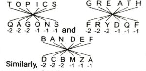 Coding – Decoding (SSC MTS 2021 Tier 1)Total Questions: 2611. In a certain code language, ‘TANK’ is coded as ‘4’ and ‘PIR’ is coded as ‘3’. How will ‘FREIGHT’ be coded in that language? [S.S.C MTS 06/07/2022 (Afternoon)](a) 7(b) 9(c) 6(d) 5Correct Answer: (a) 7Solution:Each word is coded by the number of letters in that word. TANK = 4, PIR = 3 Similarly,In FREIGHT, number of letters are 7. Hence, option (a) is the correct answer.12. R 4 is related to P 2 in a certain way. In the same way, F 7 is related to D 5. To which of the following is Z 8 related following the same logic? [S.S.C MTS 06/07/2022 (Afternoon)](a) X 6(b) Y 6(c) X 7(d) Y 7Correct Answer: (a) X 6Solution:R4 ⇒ (R - 2) = P, (4 - 2) = 2 → P 2 F7 ⇒ (F - 2) = D, (7 - 2) = 5 → D 5 Similarly,Z 8 ⇒ (Z - 2) = X, (8 - 2) = 6 → X 6 Hence, the required answer is X 6.13. In a certain code language, ‘Numbers are even’ is coded as ‘5 3 +’ and ‘Odd factors are multiples’ is coded as ‘+ 7 6 @’. What can be the code for ‘even’ in that code language? [S.S.C MTS 06/07/2022 (Evening)](a) 6(b) +(c) 5 or 3(d) 7Correct Answer: (c) 5 or 3Solution:From "Numbers are even" and "Odd factors are multiples", we get "are" = "#". So, the code for "even" will be either "5" or "3". Hence, option (c) is the correct answer.14. In a certain code language, if dress is called comb, comb is called hair dryer, hair dryer is called lipstick, lipstick is called sandal, and sandal is called jewellery, then what is used to colour the lips? [S.S.C MTS 06/07/2022 (Evening)](a) Jewellery(b) Comb(c) Hair dryer(d) SandalCorrect Answer: (d) SandalSolution:Usually lipstick is used to colour the lips and here lipstick is called sandal. Hence, option (d) is the correct answer.15. In a certain code language, ‘random boys talk’ is written as ‘8 3 P’, ‘talk too much girls’ is written as ‘3 4 2 6’. How will ‘talk’ be written in that language? [S.S.C MTS 07/07/2022 (Morning)](a) 3(b) P(c) 2(d) 8Correct Answer: (a) 3Solution:From "random boys talk" and "talk too much girls", we get "talk" = 3 Hence, option (a) is the correct answer.16. In a certain code language, ‘TOPICS’ is written as ‘QAGONS’ and ‘GREATH’ is written as ‘FRYDQF’. How will ‘BANDEF’ be written in that language? [S.S.C MTS 08/07/2022 (Morning)](a) DCCMZA(b) DCBMZA(c) DCBMYA(d) DCBNYACorrect Answer: (b) DCBMZASolution:17. In a certain code language, ‘nu vu du’ is written as ‘Time and Money’, ‘hu du ru’ is written as ‘Manage Money Judiciously’ and ‘tu vu lu’ is written as ‘Save More Time’. What is the code for ‘Save More Money’ in that code language? [S.S.C MTS 08/07/2022 (Afternoon)](a) du nu lu(b) nu tu du(c) tu lu du(d) tu vu duCorrect Answer: (c) tu lu duSolution:Hence, "Save More Money" → "tu lu du".18. In a certain code language, '591' means ‘sky is blue’, '256' means ‘sea is deep’ and '609' means ‘sea looks blue’. Which number is the code for ‘blue’ in that language? [S.S.C MTS 11/07/2022 (Afternoon)](a) 0(b) 9(c) 1(d) 5Correct Answer: (b) 9Solution:From "sky is blue" and "sea looks blue", we get blue → "9". Hence, option (b) is the correct answer.19. D 2 is related to H 6 in a certain way. In the same way, L 1 is related to P 15. To which of the following is T 18 related following the same logic? [S.S.C MTS 12/07/2022 (Morning)](a) Z 22(b) X 22(c) Y 22(d) W 22Correct Answer: (b) X 22Solution:D 2 ⇒ {(D + 4) = H and (2 + 4) = 6} → H 6 L 1 ⇒ {(L + 4) = P and (1 + 14) = 15} → P 15 Similarly,T 18 ⇒ {(T + 4) = X and (4 + 18) = 22} → X 22Hence, option (b) is the correct answer.20. In a certain code language, ‘ANAEMIA’ is written as ‘AOAENIA’ and ‘AQUEOUS’ is written as ‘ARUEOUST’. How will ‘EUGENIA’ be written in that language? [S.S.C MTS 12/07/2022 (Morning)](a) EUHEOJA(b) FVGFJNB(c) EUHEOIA(d) FUGFNJBCorrect Answer: (c) EUHEOIASolution:Each consonant is replaced by a letter at +1 position while each vowel is kept as it is.Submit Quiz« Previous123Next »