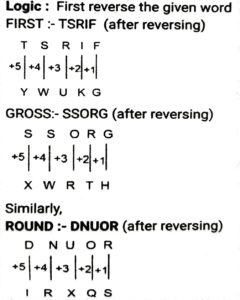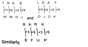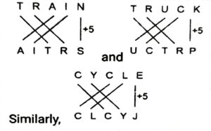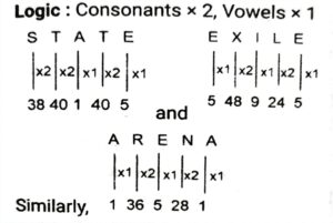 Coding – Decoding (SSC Selection Post (Phase – X) )Total Questions: 2621. In a certain code language, ‘STATE’ is written as ‘38401405’ and ‘EXILE’ is written as ‘5489245’. How will ‘ARENA’ be written in that language? [Higher Secondary 04/08/2022 (Shift - 3)](a) 1365281(b) 1365141(c) 21810142(d) 21181014Correct Answer: (a) 1365281Solution:22. In a code language, ‘MUSCLE’ is coded as USMLEC and ‘FINGER’ is coded as INFERG. How will ‘THROAT’ be coded in the same language? [Higher Secondary 04/08/2022 (Shift - 3)](a) HTRAOT(b) HTROAT(c) RHTTAO(d) HRTATOCorrect Answer: (d) HRTATOSolution:23. In a code language, ‘PALM’ is coded as 16-1-12-13 and ‘HEAD’ is coded as 8-5-1-4. How will ‘NECK’ be coded in the same language? [Higher Secondary 04/08/2022 (Shift - 3)](a) 13-5-3-11(b) 14-5-3-10(c) 14-5-3-11(d) 13-5-3-10Correct Answer: (c) 14-5-3-11Solution:Letters are coded to their place value. PALM → 16 - 1 - 12 - 13 HEAD → 8 - 5 - 1 - 4 Similarly,NECK → 14 - 5 - 3 - 1124. In a certain code language, ‘TREE’ is written as 'WWHJ' and 'LEAF' is written as 'OJDK'. How will ‘BARK’ be written in that language? [Higher Secondary 04/08/2022 (Shift - 3)](a) GFUN(b) EFTP(c) EFUP(d) GDWNCorrect Answer: (c) EFUPSolution:25. In a certain code language, 'FIRST' is written as 'YWUKG' and 'GROSS' is written as 'XWRTH'. How will 'ROUND' be written in that language? [Higher Secondary 04/08/2022 (Shift - 3)](a) JQXQS(b) IRYQS(c) HRXQS(d) IRXQSCorrect Answer: (d) IRXQSSolution: 26. In a code language, ‘TRAIN’ is written as AITRS, and ‘TRUCK’ is written as UCTRP. How will ‘CYCLE’ be written in the same language? [Higher Secondary 04/08/2022 (Shift - 3)](a) CLCYJ(b) CCYLE(c) CLYCJ(d) CLCYMCorrect Answer: (a) CLCYJSolution:Submit Quiz« Previous123