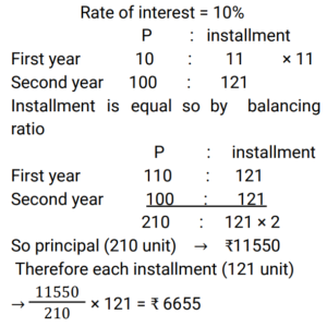 5. Rajani borrowed an amount of 11,550 at an interest rate of 10% per annum, compounded annually. She repaid the entire amount with interest in two equal installments, the installments being paid at the end of the first and the second years from the date of borrowing. What is the value of each installment, if interest is computed on reducing balance ? [Group D 12/09/2022 (Afternoon) ]