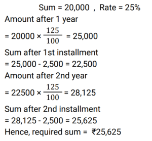 7. A person borrows ₹20,000 at 25% compound interest per year, compounded annually. At the end of every year, he pays ₹2,500 as part payment. How much does he still owe after two such installments? [Group D 30/09/2022 (Morning)]