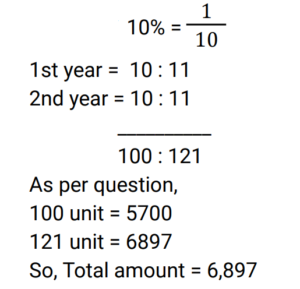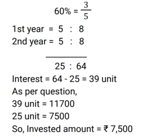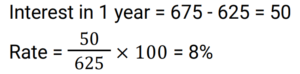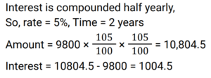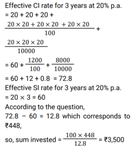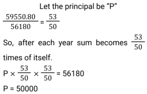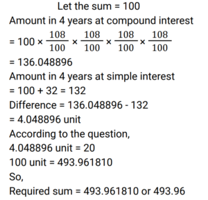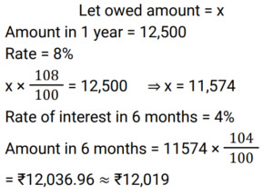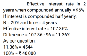 Compound Interest (Railway Maths) (Part – II)Total Questions: 501. A trader owes a merchant ₹12,500 due in one year. However, the trader wants to settle the amount after 6 months. If the rate of interest is 8% per annum, then how much money should he pay? (Give your answer correct to the nearest whole number value.) [Group D 06/10/2022 (Afternoon)](a) ₹12,091(b) ₹10,291(c) ₹10,219(d) ₹12,019Correct Answer: (d) ₹12,019Solution:2. The difference between the compound interest and the simple interest, compounded annually, on a certain sum of money for 4 years at 8% per annum is ₹20. Find the sum. (Give your answer correct to 2 decimal places.) [Group D 06/10/2022 (Evening)](a) ₹473.83(b) ₹463.83(c) ₹493.96(d) ₹483.83Correct Answer: (c) ₹493.96Solution:3. A certain sum on compound interest becomes ₹56,180 when compounded annually after 2 years and ₹59,550.80 after 3 years. Find the sum (in ₹). [Level 6 (09/05/2022) Shift 1](a) 48,700(b) 50,000(c) 52,500(d) 45,000Correct Answer: (b) 50,000Solution:4. The difference between the interest payable on a sum invested for three years at 20% compound interest per annum compounded annually and 20% simple interest per annum for the same period is ₹448. What is the value of the sum invested? [Level 6 (09/05/2022) Shift 1](a) ₹3,750(b) ₹4,000(c) ₹3,500(d) ₹3,000Correct Answer: (c) ₹3,500Solution:5. A sum of Rs 98.00 was invested for a year at 10% interest per annum, compounded half-yearly. What would be the interest payable at the end of the year? [Level 5 (12/06/2022) Shift 1](a) 1,003.50(b) 1,004.50(c) 1,005.60(d) 980Correct Answer: (b) 1,004.50Solution:6. A sum of money at certain rate of interest when compounded annually becomes Rs 625 in 3 years and Rs 675 in 4 years. What is the rate of interest per annum? [Level 5 (12/06/2022) Shift 1](a) 8%(b) 4%(c) 7%(d) 6%Correct Answer: (a) 8%Solution:7. Rahul invested a certain sum for two years at 60% p.a. compound interest, compounded annually. If at the end of two years he received interest of ₹11,700, then how much did he initially invest? [Level 5 (12/06/2022) Shift 2](a) ₹7,750(b) ₹8,000(c) ₹7,500(d) ₹7,250Correct Answer: (c) ₹7,500Solution:8. A certain sum was invested at 40% p.a. compound interest for two years and the interest was compounded annually. If the interest was compounded half yearly, the amount payable on maturity after two years would have been ₹4,544 more. What was the sum invested? [Level 5 (12/06/2022) Shift 2](a) ₹37,500(b) ₹42,000(c) ₹42,500(d) ₹40,000Correct Answer: (d) ₹40,000Solution:9. If interest is compounded annually at 10% per annum , then what would be the total amount payable on maturity when a sum of Rs 5700 is invested for a period of two years ? [Level 2 (13/06/2022) Shift 1 ](a) 6887(b) 6897(c) 6997(d) 6987Correct Answer: (b) 6897Solution:10. A sum of ₹400 lent at compound interest amounts to ₹484 in 2 years, interest compounded yearly. What is the rate of interest p.a ? [Level 3 (14/06/2022) Shift 2 ](a) 10%(b) 16%(c) 11%(d) 12%Correct Answer: (a) 10%Solution:Submit Quiz12345Next »