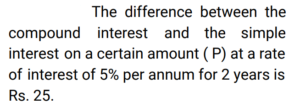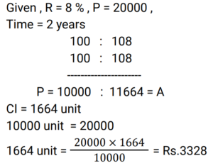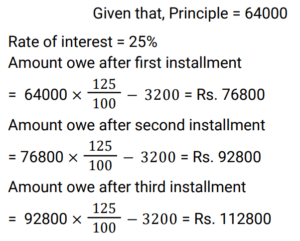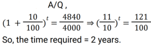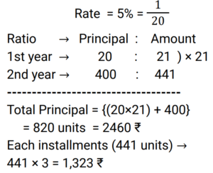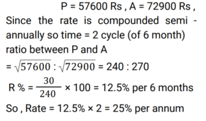 Compound Interest (Railway Maths) (Part – III)Total Questions: 5011. At what annual rate of compound interest, compounded semi-annually, will Rs. 57,600 become Rs. 72,900 in one year? [RRB NTPC 03/03/2021 (Evening)](a) 6.25% per annum(b) 12.5% per annum(c) 50% per annum(d) 25% per annumCorrect Answer: (d) 25% per annumSolution:12. A sum of money doubles itself at compound interest in 12 years. In how many years will it become 4 times ? [RRB NTPC 04/03/2021 (Morning) ](a) 36(b) 20(c) 18(d) 24Correct Answer: (d) 24Solution:13. Find the compound interest on Rs. 20,000/- in 2 years at 8% per annum, if interest is compounded yearly. [RRB NTPC 04/03/2021 (Evening)](a) Rs. 3,328.00(b) Rs. 3,109.78(c) Rs. 3,220.00(d) Rs. 3,200.00Correct Answer: (a) Rs. 3,328.00Solution:14. What is the principal amount which earns Rs. 154/- as a compound interest for the second year at 10% per annum? [RRB NTPC 04/03/2021 (Evening)](a) Rs. 2,750.50(b) Rs. 1,540.00(c) Rs. 1,200.00(d) Rs. 1,400.00Correct Answer: (d) Rs. 1,400.00Solution:15. The compound interest on Rs. 20,000 in 2 years at 4% per year, the interest being compounded half-yearly, will be: [RRB NTPC 08/03/2021 (Morning)](a) Rs. 1648.64(b) Rs. 1500(c) Rs. 1700(d) Rs. 1842.64Correct Answer: (a) Rs. 1648.64Solution:16. The difference between the compound interest and the simple interest on a certain amount at a rate of interest of 5% per annum for 2 years is Rs. 25. Find the amount. [RRB NTPC 08/03/2021 (Morning)](a) Rs. 10000(b) Rs. 8500(c) Rs. 9000(d) Rs. 7500Correct Answer: (a) Rs. 10000Solution:17. In how many years will a sum of Rs. 4,000 be increased to Re. 4,840 at 10% compound interest per annum? [RRB NTPC 08/03/2021 (Morning)](a) 2(b) 6(c) 4(d) 1Correct Answer: (a) 2Solution:18. Ramu borrows Rs. 64,000 at 25% per annum compound interest. At the end of every year he pays Rs. 3,200 as part of repayment. How much does he still owe after 3 such instalments? [RRB NTPC 08/03/2021 (Evening)](a) Rs. 1,12,800(b) Rs. 12,500(c) Rs. 1,12,500(d) Rs. 12,800Correct Answer: (a) Rs. 1,12,800Solution:19. Mahesh invested an amount of Rs. 8000 in a fixed deposit scheme for 2 years at compound interest 5 p.c.p.a. How much amount will Mahesh get on maturity of the fixed deposit? [RRB NTPC 11/03/2021 (Morning)](a) Rs. 8,800(b) Rs. 8,820(c) Rs. 8,720(d) Rs. 8,900Correct Answer: (b) Rs. 8,820Solution:20. A man borrows Rs. 2,460 to be paid back with compound interest at the rate of 5% p.a. By the end of 2 years, in equal installments. How much will each installment be? [RRB NTPC 11/03/2021 (Evening)](a) Rs. 1,275(b) Rs. 1,283(c) Rs. 1,377(d) Rs. 1,323Correct Answer: (d) Rs. 1,323Solution:Submit Quiz« Previous12345Next »