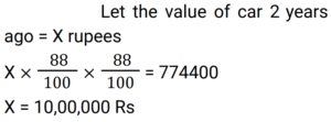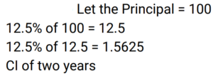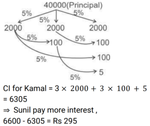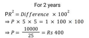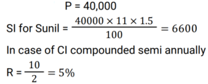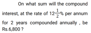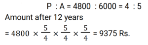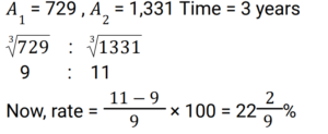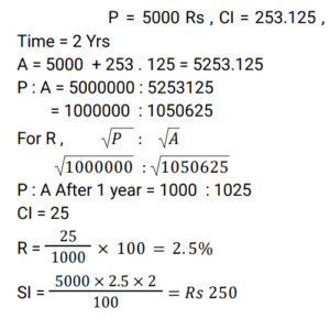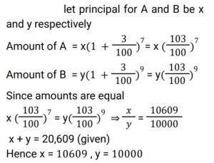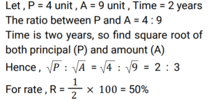 Compound Interest (Railway Maths) (Part – III)Total Questions: 5021. At what rate of compound interest per annum will a sum of Rs. 1,500 become Rs. 1,591.35 in 2 years ? [RRB NTPC 13/03/2021 (Evening) ](a) 3%(b) 2%(c) 4%(d) 5%Correct Answer: (a) 3%Solution:22. Divide Rs. 20,609 between A and B, such that the amount (in Rs.) of A after 7 years is equal to the amount (in Rs.) of B after 9 years, if the interest being compounded yearly at 3% per annum. [RRB NTPC 15/03/2021 (Morning)](a) A = Rs. 10,609, B = Rs. 10,000(b) A = Rs. 10,601, B = Rs. 10,000(c) A = Rs. 10,605, B = Rs. 10,100(d) A = Rs. 10,509, B = Rs. 10,004Correct Answer: (a) A = Rs. 10,609, B = Rs. 10,000Solution:23. Sunil and Kamal took loan of Rs. 40,000 each for 1 year 6 months from a moneylender who charged simple interest from Sunil @ 11% per annum and compound interest from Kamal @ 10% per annum compounded semi-annually. Who paid more interest and by what amount? [RRB NTPC 15/03/2021 (Evening)](a) Kamal paid Rs. 195 more(b) Sunil paid Rs. 295 more(c) They paid equal interest(d) Kamal paid Rs. 305 moreCorrect Answer: (b) Sunil paid Rs. 295 moreSolution:24. Rs. 4,800 becomes Rs. 6,000 in 4 years at a certain rate of compound interest. What will be the amount after 12 years at the same rate of compound interest? [RRB NTPC 21/03/2021 (Evening)](a) Rs. 12,000(b) Rs. 8,400(c) Rs. 9,600(d) Rs. 9,375Correct Answer: (d) Rs. 9,375Solution:25. The value of a car depreciates at the rate of 12% per annum. Its present value is Rs. 7,74,400. What was the value of the car 2 years ago? [RRB NTPC 27/03/2021 (Evening)](a) Rs. 9,99,999(b) Rs. 11,00,000(c) Rs. 9,00,000(d) Rs. 10,00,000Correct Answer: (d) Rs. 10,00,000Solution:26. A sum of money invested at a certain rate of interest compounded annually amounts to Rs.729 in 4 years and Rs.1,331 in 7 years. Find the annual rate of interest. [RRB NTPC 01/04/2021 (Evening) ](a)(b)(c)(d)Correct Answer: (c)Solution:27. The compound interest on Rs.5,000 for 2 years is Rs.253.125. What would be the interest if the same sum is invested for the same duration at the same rate of simple interest ? [RRB NTPC 01/04/2021 (Evening) ](a) Rs.250(b) Rs.255(c) Rs.248(d) Rs.240Correct Answer: (a) Rs.250Solution:28. At what rate percent year compound interest does a sum of money becomes 9/4 times of itself in 2 years? [RRB NTPC 03/04/2021 (Evening) ](a) 50%(b) 35%(c) 60%(d) 40%Correct Answer: (a) 50%Solution:29. The difference between the compound and the simple interests on a certain sum of money for two years, at 5% per annum, is Rs. 1. The Sum is : [RRB NTPC 05/04/2021 (Morning) ](a) Rs. 450(b) Rs. 550(c) Rs. 400(d) Rs. 500Correct Answer: (c) Rs. 400Solution:30. Find the answer of given question? [RRB NTPC 06/04/2021 (Evening) ](a) Rs. 27,200(b) Rs. 27,260(c) Rs. 25,600(d) Rs.54,400Correct Answer: (c) Rs. 25,600Solution:Submit Quiz« Previous12345Next »