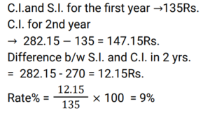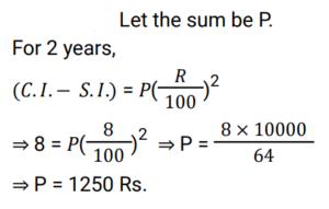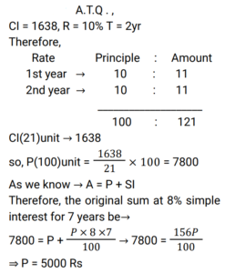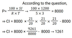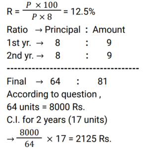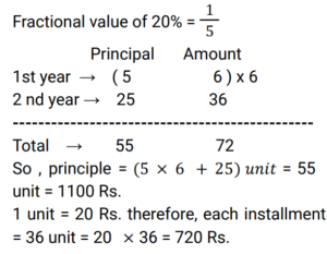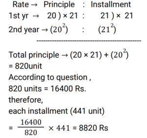 Compound Interest (Railway Maths) (Part – III)Total Questions: 5041. A sum of Rs.16400 is borrowed to be paid back in 2 years by equal payments allowing 5% Compound Interest. Find the annual payment. [RRB JE 25/05/2019 (Afternoon) ](a) Rs.7600(b) Rs.7495(c) Rs.7590(d) Rs.8820Correct Answer: (d) Rs.8820Solution:42. A certain sum of money invested at Compound Interest, compounded annually, amounts to Rs.338 at the rate of 4% per annum for 2 years. Find the sum. [RRB JE 25/05/2019 (Evening) ](a) Rs.315(b) Rs.312.50(c) Rs.320(d) Rs.318.52Correct Answer: (b) Rs.312.50Solution:43. A sum of Rs.1100 was taken as a loan. This is to be paid in two equal installments. If the rate of interest is 20% per annum, compounded annually, find the amount payable in each Installment. [RRB JE 25/05/2019 (Evening) ](a) Rs.620(b) Rs.720(c) Rs.670(d) Rs.600Correct Answer: (b) Rs.720Solution:44. A sum of money at 8% Simple Interest was placed in a deposit for 7 years. The matured amount was then invested in a scheme offering 10% Compound Interest compounded annually, thereby procuring an interest of Rs.1638 in 2 years. What was the original sum? [RRB JE 27/05/2019 (Morning) ](a) Rs.6200(b) Rs.5000(c) Rs.7500(d) Rs.8000Correct Answer: (b) Rs.5000Solution:45. A sum increases by 100% in 8 years at a certain rate of Simple Interest. What will be the Compound Interest of Rs.8000 after 2 years at the same rate of interest ? [RRB JE 29/05/2019 (Evening) ](a) Rs 2050(b) Rs 2075(c) Rs 2125(d) Rs 2025Correct Answer: (c) Rs 2125Solution:46. What is the Simple Interest on a sum of money at 12.5% for 2 years if the Compound Interest on the same sum and same period, same rate of interest is Rs. 510? [RRB JE 30/05/2019 (Evening)](a) Rs. 480(b) Rs. 500(c) Rs. 408(d) Rs. 420Correct Answer: (a) Rs. 480Solution:47. If the Simple Interest on a sum of money at 5% for 3 years is Rs. 1200, what will be the Compound Interest for the same period and rate for the same sum? [RRB JE 01/06/2019 (Afternoon)](a) Rs. 1561(b) Rs. 1461(c) Rs. 9261(d) Rs. 1261Correct Answer: (d) Rs. 1261Solution:48. The difference between Compound Interest and Simple Interest in 2 years on a certain sum is Rs.8 at 8% rate. What is the sum? [RRB JE 02/06/2019 (Morning) ](a) Rs.2000(b) Rs.1250(c) Rs.1500(d) Rs.1000Correct Answer: (b) Rs.1250Solution:49. Compound Interest and Simple Interest on a certain sum of money for 2 years is Rs.282.15 and Rs.270 respectively. The rate of interest is: [RRB JE 02/06/2019 (Evening) ](a)(b)(c)(d)Correct Answer: (c)Solution:50. A sum of money is put on Compound Interest for 2 years at 20%. It would fetch Rs.482 more if the interest is payable half yearly than if it were payable yearly. Find the sum. [RRB JE 26/06/2019 (Morning) ](a) Rs.19500(b) Rs.20000(c) Rs.21800(d) Rs.30000Correct Answer: (b) Rs.20000Solution:Submit Quiz« Previous12345