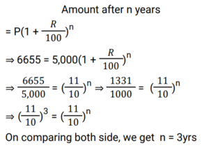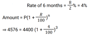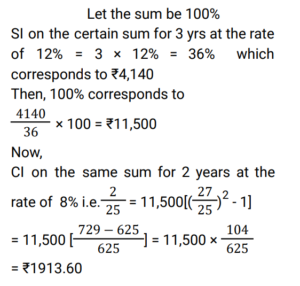 Compound Interest (Railway Maths) (Part – IV)Total Questions: 2321. In what time will ₹ 4400 become ₹ 4576 at 8% per annum interest compounded half – yearly ? [RRB ALP 17/08/2018 (Morning) ](a) 7 months(b) 1 year(c) 2 years(d) 6 monthsCorrect Answer: (d) 6 monthsSolution:22. Shams invested ₹ 5000 at 10% per annum compound interest. After n years, Shams received ₹ 1655 more. Find the value of n (in years). [RRB ALP 20/08/2018 (Afternoon) ](a) 4(b) 3(c) 1(d) 2Correct Answer: (b) 3Solution:23. The simple interest on a certain sum at 12% per annum for 3 years is ₹4,140. What is the compound interest on the same sum at 8% for two years ? [RRB ALP 29/08/2018 (Evening) ](a) ₹1,840(b) ₹1,886.50(c) ₹ 2,012.40(d) ₹1,913.60Correct Answer: (d) ₹1,913.60Solution:Submit Quiz« Previous123
