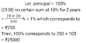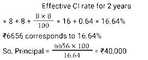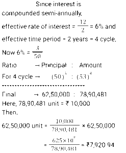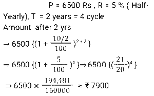 Compound Interest (SSC) (Part-3)Total Questions: 5021. A sum becomes 1.96 times of itself in 2 years when invested at compound interest (compounding annually). What is the annual rate of interest ? [SSC CHSL 16/03/2023 (4th Shift)](a) 20%(b) 25%(c) 40%(d) 30%Correct Answer: (c) 40%Solution:22. A sum amounts to Rs. 6580 in 2 years and amounts to Rs. 7896 in 3 years on compound interest (compounding annually) at the same rate of interest. What is the annual rate of interest ? [SSC CHSL 17/03/2023 (4th Shift)](a) 30%(b) 40%(c) 15%(d) 20%Correct Answer: (d) 20%Solution:23. Find the amount (integral value only) if a sum of ₹6,500 is being borrowed at 10% interest per annum for 2 years if interest is compounded half yearly. [SSC CGL Tier II (06/03/2023)](a) ₹8,150(b) ₹7,900(c) ₹7,650(d) ₹8,250Correct Answer: (b) ₹7,900Solution:24. What is the present value of Rs.10,000 received in 2 years, if the interest rate is 12% per year discounted semi-annually? [SSC CGL 09/12/2022 (2nd Shift)](a) Rs.7,020.94(b) Rs.7,920.90(c) Rs.7,920.94(d) Rs.7,900.94.Correct Answer: (c) Rs.7,920.94Solution:25. On a certain sum, the difference between compound interest and simple interest at 10% per annum for 2 years is Rs.250. The sum is _________ . [SSC CPO 09/11/2022 (Morning)](a) Rs.25,450(b) Rs.26,550(c) Rs.25,000(d) Rs.26,000Correct Answer: (c) Rs.25,000Solution:26. Find the difference between the simple interest and the compound interest payable annually on a sum of Rs.6,500 at 7% per annum for 3 years. (Correct to two decimal places.) [SSC CPO 09/11/2022 (Afternoon)](a) Rs.94.34(b) Rs.97.78(c) Rs.98.73(d) Rs.95.67Correct Answer: (b) Rs.97.7827. The compound interest (compounding annually) on a certain sum at the rate of 8 percent per annum for two years is ₹6656. What would be the simple interest on the same sum at the same rate of interest for two years? [SSC CGL Tier II (08/08/2022)](a) ₹ 5600(b) ₹ 6224(c) ₹ 6400(d) ₹ 6336Correct Answer: (c) ₹ 6400Solution:28. Arif repaid a loan by paying ₹15,625 after 3 years at a rate of 25% p.a. Compounded annually, what was the amount of the loan ? [Graduate Level 01/08/2022 (Shift-4)](a) ₹9,000(b) ₹8,000(c) ₹9,500(d) ₹10,000Correct Answer: (b) ₹8,000Solution:29. In how many years will a sum of ₹800 at 30% p.a. compounded half yearly becomes ₹1216.70? [Graduate Level 04/08/2022 (Shift-4)](a) 1.5 years(b) 1 year(c) 2.5 years(d) 2 yearsCorrect Answer: (a) 1.5 yearsSolution:30. A sum of money becomes two times of itself in 8 years at simple interest, and it becomes four times of itself in 2 years at compound interest, when interest is compounded annually. Find the ratio of the rate of simple interest to the rate of compound interest offered per year. [SSC MTS 05/07/2022 (Evening)](a) 2:3(b) 3:5(c) 5:3(d) 1:8Correct Answer: (d) 1:8Solution:Submit Quiz« Previous12345Next »