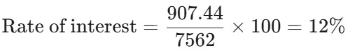 Compound Interest (SSC) (Part-4)Total Questions: 1111. A Sum amounts to Rs. 7,562 in 4 years and to Rs. 8,469.44 in 5 years at a certain rate percent per annum. When the interest is compounded annually, The rate of interest is: [SSC CPO 23/11/2020 (Morning)](a) 8%(b) 12%(c) 20%(d) 15%Correct Answer: (b) 12%Solution:Amount at the end of 4 years = 7,562 Amount at the end of 5 years = 8,469.44 Net interest = 907.44 Submit Quiz« Previous12