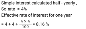 7. A money lender claims he lends money at a simple rate of interest of 8% per annum. But he cleverly includes the interest amount in the principal when he calculates it every six months. The effective rate of interest becomes: [SSC CHSL 09/08/2023 (2nd Shift)]