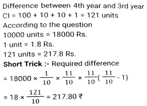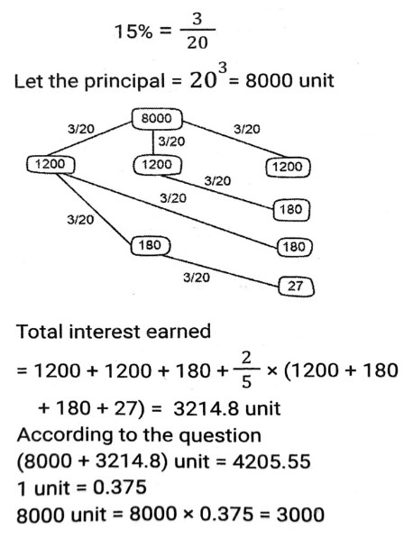 Compound Interest (SSC)Total Questions: 5021. A borrows an amount of ₹3,600 from B at a rate of 20% simple interest for 2 years and lends 75% of this amount to Cat 20% compound interest for 2 years. A uses the remaining amount for his personal purpose. Find the total loss incurred by A. [SSC MTS 12/07/2022 (Afternoon)](a) ₹928(b) ₹852(c) ₹1,152(d) ₹1,024Correct Answer: (c) ₹1,152Solution:22. In what time will ₹3,90,625 amount to ₹4,56,976 at 8% per annum, interest being compounded half - yearly? [SSC CHSL 08/06/2022 (Afternoon)](a) 2 years(b) 1½ years(c) 2½ years(d) 1 yearsCorrect Answer: (a) 2 yearsSolution:23. A certain sum is invested at 26% p.a, interest compounded annually. In how many years (approx) will it double ? [SSC CHSL 01/06/2022 (Morning)](a) 4(b) 3(c) 2(d) 5Correct Answer: (b) 3Solution:24. Divide ₹66,300 between A and B in such a way that the amount that A receives after 8 years is equal to the amount that B receives after 10 years; with interest compound being compounded annually at a rate of 10% per annum. [SSC CGL 20/04/2022 (Evening)](a) A = ₹35,520, B = ₹30,810(b) A = 35,200, B = ₹31,100(c) A = ₹37,000, B = ₹29,300(d) A = ₹36,300, B = ₹30,000Correct Answer: (d) A = ₹36,300, B = ₹30,000Solution:25. A certain sum was invested for three years in a scheme in which the interest gets compounded annually. During the first two years, the scheme provided growth at the rates of 80% and 60%, respectively, but during the third year there was a decline by 40%. What was the overall interest rate for three years? [SSC MTS 12/10/2021 (Afternoon)](a) 24%(b) 20%(c) 22.5%(d) 48.6%Correct Answer: (b) 20%Solution:26. A sum of ₹5,760 amounts to ₹7,200 in 4 years and to x in 12 years at a certain rate percent per annum, when the interest is compounded yearly in both the cases. What is the value of x ? [SSC MTS 06/10/2021 (Evening)](a) 11500(b) 11250(c) 12500(d) 12250Correct Answer: (b) 11250Solution:27. Atul borrowed a sum of Rs. 12000 and agreed to repay it by paying Rs. 4800 at the end of first year and Rs. 9240 at the end of second year. What is the rate of compound interest compounded annually ? [SSC CGL 24/08/2021 (Afternoon)](a) 10%(b) 12%(c) 8/5%(d) 8%Correct Answer: (a) 10%Solution:28. A and B together borrowed a sum of ₹51,750 at an interest rate of 7% p.a. compound interest in such a way that to settle the loan, A paid as much amount after three years as paid by B after 4 years from the day of borrowing. The sum (in ₹) borrowed by A was: [SSC CGL 05/03/2020 (Afternoon)](a) 25,000(b) 25,650(c) 24,860(d) 26,750Correct Answer: (d) 26,750Solution:29. A certain sum amounts to Rs 4,205.55 at 15% p.a. In 2⅖ years, interest compounded yearly. The sum (in) is: [SSC CGL Tier II (13/09/2019)](a) 3,200(b) 3,500(c) 2,700(d) 3,000Correct Answer: (d) 3,000Solution:30. A sum of Rs 18000 is lent at 10% p.a. compound interest, compounded annually. What is the difference between the compound interest for 3rd year and 4th year ? [SSC CGL Tier II (11/09/2019)](a) Rs 220.60(b) Rs 217.80(c) Rs 221.80(d) Rs 215.40Correct Answer: (b) Rs 217.80Solution:10% = 1/10Submit Quiz« Previous12345Next »