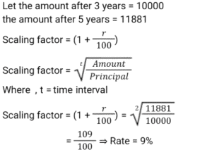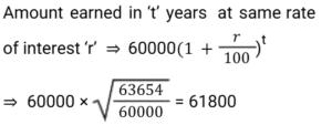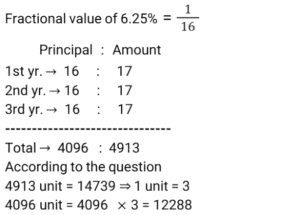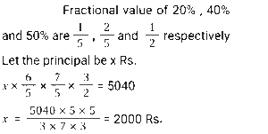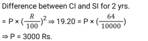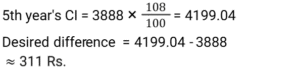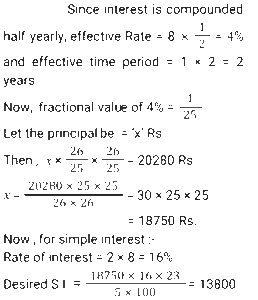 Compound Interest (SSC)Total Questions: 5031. What will be the compound interest on a sum of Rs 31,250 for 2 years at 12% p.a., if the interest is compounded 8-monthly? [SSC CGL Tier II (11/09/2019)](a) ₹8106(b) ₹8116(c) ₹8016(d) ₹8156Correct Answer: (b) ₹811632. If the compound interest in the third year at 8% p.a. on a certain sum is Rs 3600, then what is the difference between the compound interest in the 4th and 5th year? (nearest to an integer in Rs) [SSC MTS 22/08/2019 (Evening)](a) ₹304(b) ₹335(c) ₹288(d) ₹311Correct Answer: (d) ₹311Solution:33. What is the present value of Rs. 14739 payable in 3 years at the rate of 6.25% yearly compound interest ? [SSC MTS 21/08/2019 (Evening)](a) Rs 12184(b) Rs 12288(c) Rs 12473(d) Rs 12148Correct Answer: (b) Rs 12288Solution:34. If the rate of interest is 20% per annum, compounded yearly and the interest on a certain sum in the second year is Rs 250, then what will be the interest on the same sum in the fifth year [SSC MTS 20/08/2019 (Morning)](a) ₹ 518(b) ₹400(c) ₹360(d) ₹432Correct Answer: (d) ₹432Solution:35. A certain sum on invested compound interest (compounded annually) grows to Rs 5040 in three years. If the rate of interest is 20% for the first year, 40% for the second and 50% for the third year, then what is the sum ? [SSC MTS 07/08/2019 (Morning)](a) ₹1210(b) ₹2566(c) ₹1800(d) ₹2000Correct Answer: (d) ₹2000Solution:36. The simple interest on a certain sum at 20% p.a for two years is Rs. 250. What is the compound interest (compounded annually) on the same sum at the same rate for the same period? [SSC MTS 05/08/2019 (Evening)](a) ₹275(b) ₹900(c) ₹550(d) ₹750Correct Answer: (a) ₹275Solution:37. A certain amount invested at a certain rate, compounded annually, grows to an amount in five years, which is a factor of 1.1881 more than to what it would have grown in three years. What is the rate percentage ? [SSC CHSL 04/07/2019 (Evening)](a) 9(b) 8.1(c) 8(d) 9.2Correct Answer: (a) 9Solution:38. Rs 60000 invested at a certain rate for a certain even number of years, compounded annually, grows to Rs 63,654. To how much amount would it grow if it is invested at the same rate for half period? [SSC CHSL 04/07/2019 (Afternoon)](a) Rs 61800(b) Rs 61809(c) Rs 61675(d) Rs 61827Correct Answer: (a) Rs 61800Solution:39. A sum invested at 8% p.a. amounts to Rs 20280 at the end of one year, when the interest is compounded half yearly. What will be the simple interest on the same sum for 4⅗ years at double the earlier rate of interest ? [SSC CHSL 04/07/2019 (Morning)](a) Rs 13500(b) Rs 13800(c) Rs 14200(d) Rs 14500Correct Answer: (b) Rs 13800Solution:40. The difference between the compound interest and simple interest on Rs x at 8% per annum for 2 years is Rs 19.20. What is the value of x ? [SSC CGL 10/06/2019 (Afternoon)](a) 2,500(b) 3,200(c) 2,800(d) 3,000Correct Answer: (d) 3,000Solution:Submit Quiz« Previous12345Next »