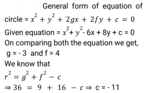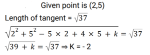 Coordinate Geometry (Railway Maths)Total Questions: 5721. If the length of the tangent from (2, 5) to x² + y² - 5x + 4y + k = 0 is √37 units, then the value of k is: [RRB NTPC 08/02/2021 (Evening)](a) 2(b) 1(c) -2(d) -1Correct Answer: (c) -2Solution:22. The area of the triangle formed by the line 2x - 4y - 7 = 0 with the coordinate axis is: [RRB NTPC 11/02/2021 (Evening)](a) 49/8 unit²(b) 49/4 unit²(c) 49/2 unit²(d) 49/16 unit²Correct Answer: (d) 49/16 unit²Solution:23. The distance between two points (a cosα, 0) and (0, a sinα) is ____ [RRB NTPC 11/02/2021 (Evening)](a) a(b) |a|(c) |2a|(d) 2aCorrect Answer: (b) |a|Solution:24. If the radius of the circle x² + y² - 6x + 8y + c = 0 is 6, then the value of c is: [RRB NTPC 11/02/2021 (Evening)](a) -10(b) -11(c) 11(d) 25Correct Answer: (b) -11Solution:25. The position of the point (1, 2) with respect to the circle x² + y² - 3x - 4y + 1 = 0 [RRB NTPC 22/02/2021 (Morning)](a) Lies on the circle(b) Lies outside the circle(c) Lies inside the circle(d) Cannot be decidedCorrect Answer: (c) Lies inside the circleSolution:26. What is the value of β, if the equation β(x + 1)²/3 + (y + 2)²/4 = 1 is a circle? [RRB NTPC 02/03/2021 (Evening)](a) 4/3(b) 3/4(c) 1(d) 12Correct Answer: (b) 3/4Solution:27. Find the radius of the circle x² + y² + 7x + 4y + 9 = 0. [RRB NTPC 04/03/2021 (Morning)](a) √19/2(b) √13/2(c) √23/2(d) √29/2Correct Answer: (d) √29/2Solution:28. The distance from the origin to the line 4x + 3y + 6 = 0 is: [RRB NTPC 04/03/2021 (Morning)](a) 7/5(b) 4/5(c) 6/5(d) 3/5Correct Answer: (c) 6/5Solution:29. The intercepts made by the plane 3x - 4y - 2z = 6 with the coordinate axis are: [RRB NTPC 07/03/2021 (Evening)](a) -2, -3/2, 3(b) 2, 3/2, -3(c) -2, 3/2, 3(d) 2, -3/2, -3Correct Answer: (d) 2, -3/2, -3Solution:30. If the distance between two points (x , 7) and (1 , 15) is 10 units, then the possible values of x = ? [RRB NTPC 08/03/2021 (Evening) ](a) 7 , - 5(b) 4 , 5(c) 5 , - 7(d) 3 , 7Correct Answer: (a) 7 , - 5Solution:Submit Quiz« Previous123456Next »