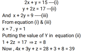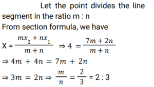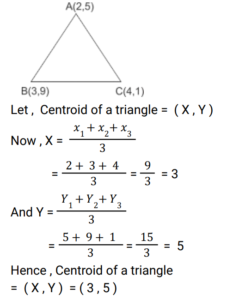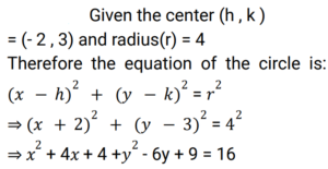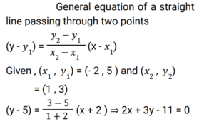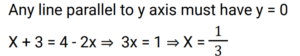 Coordinate Geometry (Railway Maths)Total Questions: 5731. Which of the following points lies on the x-axis? [RRB NTPC 09/03/2021 (Morning)](a) (2, 3)(b) (2, 0)(c) (1, 2)(d) (0, 4)Correct Answer: (b) (2, 0)Solution:(2 , 0) lies on x - axis because here , y coordinate = 032. If the center of a circle (c) is (-2, 3) and its radius is 4, then find the equation of the circle. [RRB NTPC 09/03/2021 (Evening)](a) x² + y² + 4x + 6y - 3 = 0(b) x² + y² + 4x - 6y - 3 = 0(c) x² + y² - 4x + 6y - 3 = 0(d) x² + y² - 4x + 6y + 3 = 0Correct Answer: (b) x² + y² + 4x - 6y - 3 = 0Solution:33. Find the centroid of a triangle formed by the points (2, 5), (3, 9) and (4, 1) [RRB NTPC 11/03/2021 (Evening)](a) (6, 6)(b) (9, 15)(c) (3, 9)(d) (3, 5)Correct Answer: (d) (3, 5)Solution:34. Find the relation between x and y such that the point (x, y) is equidistant from (5, 3) and (4, 6). [RRB NTPC 12/03/2021 (Morning)](a) x + 3y + 9 = 0(b) x - 3y = 9(c) x + 3y = 9(d) 3y - x = 9Correct Answer: (d) 3y - x = 9Solution:35. The ratio in which point (4, 5) divides the line joining two points (2, 3) and (7, 8) is: [RRB NTPC 13/03/2021 (Morning)](a) 2 : 3(b) 1 : 2(c) 4 : 5(d) 3 : 4Correct Answer: (a) 2 : 3Solution:36. The equation of a straight line passing through (-2, 5) and (1, 3) is: [RRB NTPC 13/03/2021 (Evening)](a) 3x - 2y - 11 = 0(b) 2x - 3y - 19 = 0(c) 3x + 2y + 19 = 0(d) 2x + 3y - 11 = 0Correct Answer: (d) 2x + 3y - 11 = 0Solution:37. The intercepts made by the plane 3x - 4y - 2z = 6 with the coordinate axis are: [RRB NTPC 13/03/2021 (Evening)](a) 2, 3/2, -3(b) -2, -3/2, 3(c) -2, 3/2, 3(d) 2, -3/2, -3Correct Answer: (d) 2, -3/2, -3Solution:38. If 2x + y=15, y + 2z = 17 and x + 2y = 9, then the value of 4x + 3y + z = ? [RRB NTPC 15/03/2021 (Morning) ](a) 37(b) 40(c) 39(d) 38Correct Answer: (c) 39Solution:39. Which of the following equations represent a line parallel to y - axis ? [RRB NTPC 15/03/2021 (Evening) ](a) y = 3(b) x + 3 = 4 - 2x(c) 2x + y = 0(d) y - 2 = 1Correct Answer: (b) x + 3 = 4 - 2xSolution:40. A circle x² + y² = a² passes through a point (0, 4). What is the value of a? [RRB NTPC 05/04/2021 (Morning)](a) 6(b) 4(c) 8(d) 5Correct Answer: (b) 4Solution:Submit Quiz« Previous123456Next »