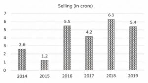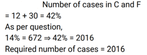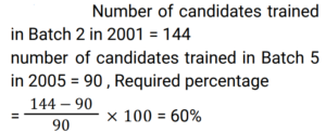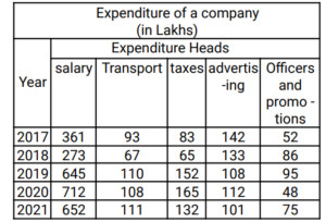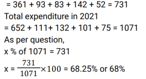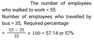 Data Interpretation (Railway Maths) (Part – I)Total Questions: 5011. The following chart shows the sales of the company during different years from the year 2014 to 2019. Study the chart, and answer the question asked. [Group D 24/08/2022 (Afternoon) ]During which years was the sales less than the average sales of all the six years?(a) 2014 only(b) 2014 and 2017 only(c) 2014, 2015 and 2016(d) 2014 and 2015 onlyCorrect Answer: (d) 2014 and 2015 onlySolution:12. The following line graph shows the annual profit percentage earned by a car manufacturing company during the period 2007-2012. [Level 6 (09/05/2022) Shift 1 ]In which of the following years was the annual profit percentage closest to the average of the annual profit percentage in all the years given in the graph?(a) 2008(b) 2009(c) 2007(d) 2011Correct Answer: (a) 2008Solution:13. The following table presents the number of candidates trained by a training centre over 6 years (2001 to 2006). [Level 6 (09/05/2022) Shift 2 ]The number of candidates trained in Batch 2 in 2001 was what percentage more than the number of candidates trained in Batch 5 in 2005?(a) 32%(b) 20%(c) 60%(d) 85%Correct Answer: (c) 60%Solution:14. The expenditures (in thousands) of two companies (A and B) on various heads in a given year are provided in the following bar graph. [Level 4 (10/05/2022) Shift 1 ]The expenditure made by both companies together on salary was approximately that percentage of their expenses on infrastructure?(a) 57%(b) 95%(c) 29%(d) 76%Correct Answer: (d) 76%Solution:15. The following table presents the expenditure of a company on various heads over five years. [Level 5 (12/06/2022) Shift 1 ]The company's total expenditure in 2017 was approximately what percentage of total expenditure is 2021?(a) 68%(b) 71%(c) 61%(d) 55%Correct Answer: (a) 68%Solution:16. The following pie chart shows the percentage of crime cases reported in a particular year across various states. [Level 5 (12/06/2022) Shift 2 ]If the crime cases in state A (14% in the pie chart) were 672 in that year, what was the number of cases reported in state C and state F together? (a) 1060(b) 800(c) 2016(d) 1214Correct Answer: (c) 2016Solution:17. The following graph shows the number of employees using different modes of transport to reach their workplace. [Level 2 (13/06/2022) Shift 1 ]The number of employees who walked to work was approximately what percentage more than those who travelled by bus?(a) 45%(b) 57%(c) 35%(d) 18%Correct Answer: (b) 57%Solution:18. The following graph represents the number distribution of all the directors in the film industry of country X by their birth origin. [Level 2 (13/06/2022) Shift 2 ]What is the ratio of the number of directors from the continent of America to the total number of directors?(a) 1 : 6(b) 1 : 5(c) 1 : 3(d) 1 : 4Correct Answer: (b) 1 : 5Solution:19. Study the given pie-chart and answer the question that follows. A newspaper decided to bring its golden jubilee issue consisting of 60 pages. The proportion for the coverage of various types in this issue was pre-decided and the same is given in the pie-chart. [Level 3 (14/06/2022) Shift 1 ]How many pages were dedicated to sports and editorial coverage?(a) 18(b) 20(c) 19(d) 21Correct Answer: (d) 21Solution:Pages dedicated to sports and editorial coverage = 28 + 7 = 35% Total number of pages = 35% of 60 = 2120. Given is the data on the weights of some students. What is the mean weight (in kg) of all these students taken together? [Level 3 (14/06/2022) Shift 2 ](a) 22(b) 26(c) 23(d) 28Correct Answer: (b) 26Solution:Submit Quiz« Previous12345Next »