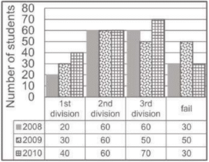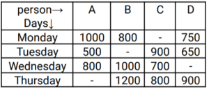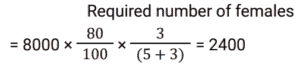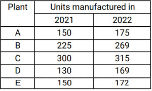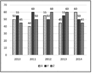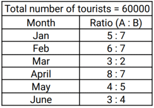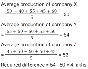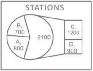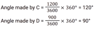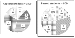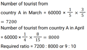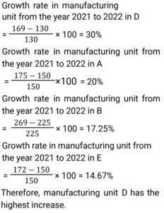 Data Interpretation (SSC)Total Questions: 4321. The following pie charts show the data of the number of appeared and passed students of class 12 in sections A,B,C,D and E. [Graduate Level 24/06/2024 (Shift - 3)] Find the difference between the number of students who appeared for the exam in sections A and B(a) 30(b) 60(c) 50(d) 40Correct Answer: (d) 40Solution:22. Which of the following recorded the highest growth rate in manufacturing units from the year 2021 to the year 2022? [Graduate Level 26/06/2024 (Shift - 4)](a) D(b) A(c) B(d) ECorrect Answer: (a) DSolution:23. Study the given bar - graph and answer the question that follows. The bar - graph shows the higher secondary students of a school for the years 2008, 2009 and 2010. [SSC CPO 03/10/2023 (1st Shift)] The percentage of students who passed in the second division in the year 2010 was :(a) 28%(b) 32%(c) 25%(d) 30%Correct Answer: (d) 30%Solution:24. What is the central angle corresponding to the expenditure spent on Education in the given figure? [SSC CPO 03/10/2023 (1st Shift)](a) 42°(b) 52°(c) 55.2°(d) 55.8°Correct Answer: (d) 55.8°Solution:25. Darjeeling gets tourists from two countries A and B. Percentage wise distribution of the influx is given below for the first six months of the year. [SSC CPO 03/10/2023 (1st Shift)] Find the ratio of tourists from country A coming in during March and April.(a) 3 ∶ 7(b) 4 ∶ 7(c) 7 ∶ 10(d) 9 ∶ 10Correct Answer: (d) 9 ∶ 10Solution:26. The table given below shows the number of products sold by 4 shopkeepers A, B, C and D on four different days. [SSC CPO 03/10/2023 (2nd Shift)] If the total products sold by A and B, including all four days, is 3000 and 3500, respectively, the products sold by B on Tuesday is how many more or less than the products sold by A on Thursday?(a) 200 less(b) 200 more(c) 300 more(d) 300 lessCorrect Answer: (a) 200 lessSolution:According to the question, Products sold by B on tuesday = 3500 - (800 + 1000 + 1200) = 500 Products sold by A on thursday = 3000 - (1000 + 500 + 800) = 700 Required value = 700 - 500 = 200 (less)27. The following table shows the percentage population of four towns below poverty line and the proportion of males and females : [SSC CPO 04/10/2023 (2nd Shift)] If the total population of town C is 8000 then what is the number of females above the poverty line in town C ?(a) 2600(b) 2400(c) 2200(d) 2000Correct Answer: (b) 2400Solution:28. The graph shows the production of tyres (in Lakhs) by three different companies X, Y and Z over the years. Directions: Study the following graph carefully to answer the question given below it. [SSC MTS 01/09/2023 (1st Shift)] What is the difference between the average production per year of the company with the highest average production and that of the company with the lowest average production in Lakhs ?(a) 2(b) 6(c) 8(d) 4Correct Answer: (d) 4Solution:29. A person jogged daily as per the given table: [SSC MTS 11/09/2023 (2nd Shift)] What is the mean distance jogged by the person in a week ?(a) 2(b) 3.5(d) 3(c) 2.5Correct Answer: (d) 3Solution:30. The number of stations in four different cities A, B, C and D are given below. [SSC CHSL 02/08/2023 (2nd Shift)] The angles made by the cities C and D on pie chart are _______ degrees and _______ degrees, respectively.(a) 150, 70(b) 70, 150(c) 90, 12(d) 120, 90Correct Answer: (d) 120, 90Solution:Submit Quiz« Previous12345Next »