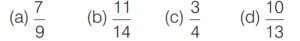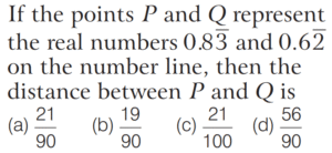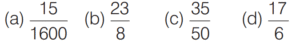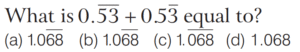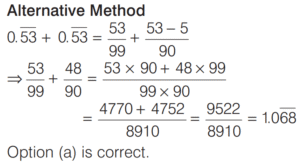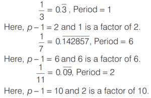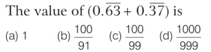 DECIMAL FRACTIONS (CDS)Total Questions: 81. Simplify the question [2019 (I) Morning Shift ](a)(b)(c)(d)Correct Answer: (a)Solution: 2. Simplify the question [2018 (I) Morning Shift ](a) 0(b) 0.099(c) 0.1(d) 0.09Correct Answer: (c) 0.1Solution:3. Which one of the following decimal numbers is a rational number with denominator 37? [2018 (I) Morning Shift ](a) 0.459459459…(b) 0. 458458458…(c) 0.0459459459…(d) 0.00459459…Correct Answer: (a) 0.459459459…Solution:Checking the options, we get4. Simplify the question [2017 (II) Evening Shift ](a)(b)(c)(d)Correct Answer: (b)Solution:5. Which one among the following is the largest? [2017 (I) Morning Shift ](a)(b)(c)(d)Correct Answer: (b)Solution:6. Which one of the following rational numbers has non-terminating and repeating decimal expansion? [2016 (II) Evening Shift ](a)(b)(c)(d)Correct Answer: (d)Solution: 7. Simplify the question [2015 (II) Evening Shift ](a)(b)(c)(d)Correct Answer: (c)Solution:8. Let p be a prime number other than 2 or 5. One would like to express the vulgar fraction 1/p in the form of a recurring decimal. Then, the decimal will be [2015 (I) Morning Shift ](a) a pure recurring decimal and its period will be necessarily (p −1)(b) a mixed recurring decimal and its period will be necessarily (p −1)(c) a pure recurring decimal and its period will be some factor of (p −1)(d) a mixed recurring decimal and its period will be some factor of (p −1)Correct Answer: (c) a pure recurring decimal and its period will be some factor of (p −1)Solution:Value of p may be 3, 7, 11, 13.Submit Quiz