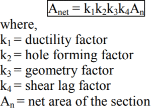 All these factors reduce the effectiveness of the member, but shear lag is the most important. The modified net area is called effective net area and may be defined by the following equation