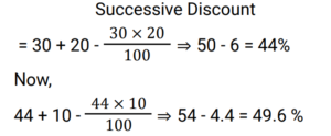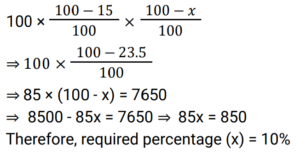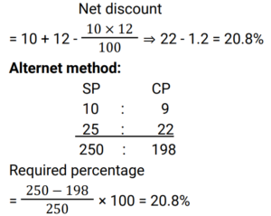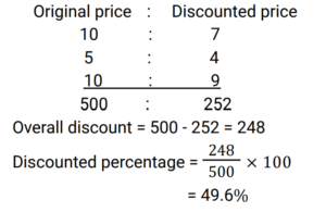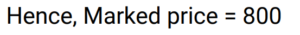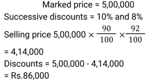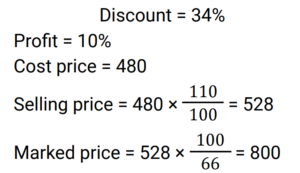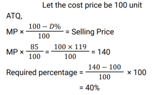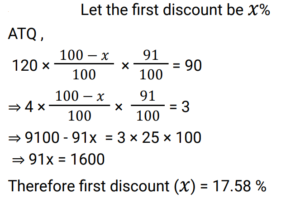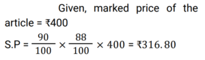 Discount (Railway Maths) (Part – I)Total Questions: 6031. The marked price of an article is ₹400 and successive discounts of 10% and 12% are offered on its sale. The selling price of the article is: [Group D 18/09/2022 (Afternoon)](a) ₹313.80(b) ₹323.80(c) ₹316.80(d) ₹306.80Correct Answer: (c) ₹316.80Solution:32. What is the net discount, if two successive discounts of 10% and 12% are given? [Group D 22/09/2022 (Morning)](a) 21.4%(b) 20.8%(c) 23.2%(d) 22.0%Correct Answer: (b) 20.8%Solution:33. Two successive discounts of 15% and X% on the sale of an item are equivalent to a single discount of 23.5%. What is the value of X%? [Group D 22/09/2022 (Morning)](a) 11%(b) 12%(c) 10%(d) 9%Correct Answer: (c) 10%Solution:34. Find the single percentage discount equivalent to three successive discounts of 30%, 20% and 10% respectively. [Group D 26/09/2022 (Evening)](a) 64.6%(b) 49.6%(c) 50.4%(d) 46.4%Correct Answer: (b) 49.6%Solution:35. After two successive discounts, a tie with a list price of ₹120 is available at ₹90. If the second discount is 9%, what is the first discount percentage? [Give your answer correct to 2 places of decimal.] [Group D 27/09/2022 (Morning)](a) 17.58%(b) 84.42%(c) 71.58%(d) 63.33%Correct Answer: (a) 17.58%Solution:36. Find the single percentage discount equivalent to three successive discounts of 30%, 20% and 10% [Group D 27/09/2022 (Morning)](a) 49.6%(b) 46.9%(c) 50.4%(d) 60%Correct Answer: (a) 49.6%Solution:37. A tradesman allows a discount of 15% on the marked price. How much above the cost price must he mark his goods to gain 19% through the above transaction? [Group D 28/09/2022 (Evening)](a) 40%(b) 30%(c) 50%(d) 25%Correct Answer: (a) 40%Solution:38. If a% is the first discount and b% is the second discount on the marked price of an article, then an equivalent single discount percentage is given by: [Group D 29/09/2022 (Afternoon)](a) a + b − ab/100(b) a + b + ab/100(c) a + b − (a − b)/100(d) a + b − (a + b)/100Correct Answer: (a) a + b − ab/100Solution:39. The marked price of a car is ₹5,00,000. Under a scheme successive discounts of 10% and 8% are offered on it. Find the total discount offered while selling the car under the given scheme. [Group D 29/09/2022 (Afternoon)](a) ₹90,000(b) ₹76,000(c) ₹86,000(d) ₹82,000Correct Answer: (c) ₹86,000Solution:40. A shopkeeper sells a pair of shoes at a discount of 34% and still makes a profit of 10%. If the cost price of the pair of shoes is ₹480, find its marked price. [Group D 29/09/2022 (Evening) ](a) ₹850(b) ₹820(c) ₹800(d) ₹700Correct Answer: (c) ₹800Solution:Submit Quiz« Previous123456Next »