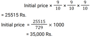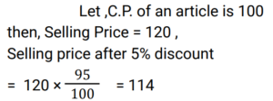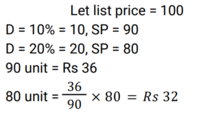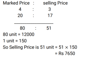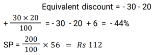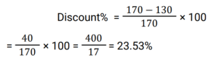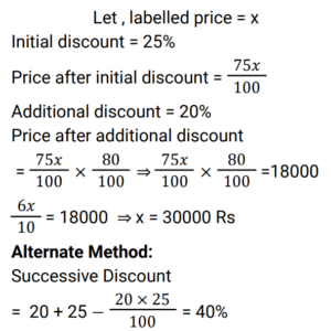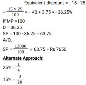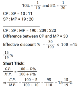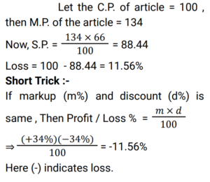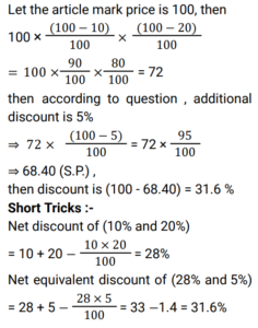 Discount (Railway Maths) (Part – I)Total Questions: 6051. Big Mart is offering a 5% discount on card payment. How much percentage above cost price should the marked price be so as to make a profit of 10%. [RRB NTPC 01/02/2021 (Evening) ](a)(b)(c)(d)Correct Answer: (d)Solution:52. If the selling price of Rs. 36 results in a 10% discount on a list price, what selling price will result in a 20% discount on the list price? [RRB NTPC 03/02/2021 (Morning)](a) Rs. 36(b) Rs. 50(c) Rs. 32(b) Rs. 50Correct Answer: (c) Rs. 32Solution:53. A salesman offers 20% additional discount after offering an initial discount of 25% on the labelled rate of a laptop. If the final sale price of the laptop is Rs. 18,000, then what was its labelled rate? [RRB NTPC 15/02/2021 (Evening)](a) Rs. 40,000(b) Rs. 28,000(c) Rs. 35,000(d) Rs. 30,000Correct Answer: (d) Rs. 30,000Solution:54. A man purchased a fan which had a printed price of Rs. 200. If he received two successive discounts of 30% and 20%, then how much did he pay for the fan? [RRB NTPC 07/03/2021 (Morning)](a) Rs. 115(b) Rs. 108(c) Rs. 112(d) Rs. 90Correct Answer: (c) Rs. 112Solution:55. Ramu purchased a TV set with an additional 15% discount on the reduced price after deducting 25% discount on the labelled price. If the labelled price was Rs. 12,000, at what price did he purchase the TV set? [RRB NTPC 11/03/2021 (Morning)](a) Rs. 7,650(b) Rs. 7,000(c) Rs. 7,560(d) Rs. 7,600Correct Answer: (a) Rs. 7,650Solution:56. A shopkeeper gives a discount of 10% once in 4 months. If a man purchases an article in this scheme for Rs.25515 in December, then what was the initial price in January ? [RRB JE 22/05/2019 (Evening) ](a) Rs.40000(b) Rs.35000(c) Rs.45000(d) Rs.36000Correct Answer: (b) Rs.35000Solution:57. Two successive discounts of 10% and 20% are advertised in a sale. If there is an additional 5% discount on cash payment, what is the overall discount, if the purchase is done by cash ? [RRB JE 26/06/2019 (Morning) ](a) 40%(b) 35%(c) 31.6%(d) 32%Correct Answer: (c) 31.6%Solution:58. Determine the actual profit per cent from the given details. [RRB JE 26/06/2019 (Morning) ]1. With no discount, the profit would have been 20% 2. However a 5% discount is offered(a) 15%(b) 12%(c) 14%(d) 20%Correct Answer: (c) 14%Solution:59. A shopkeeper gives a discount of 34% on the sale of an article after marking it 34% above the cost price. Then find the total percentage profit or loss made by him. [RPF S.I. 24/12/2018 (Morning) ](a) 11.56%(b) 10.24%(c) 9.84%(d) 12.64%Correct Answer: (a) 11.56%Solution:60. The rate of discount on an article whose marked price is ₹170 and selling price is ₹130 is : [RRB ALP 17/08/2018 (Morning) ](a) 23.60%(b) 24.26%(c) 23.53%(d) 22.45%Correct Answer: (c) 23.53%Solution:Submit Quiz« Previous123456