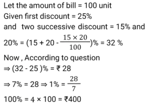 4. The difference between a discount of 25% and two successive discounts of 15% and 20% on a certain bill was ₹28. Find the amount of the bill. [SSC CGL 12/09/2024 (3rd Shift)]